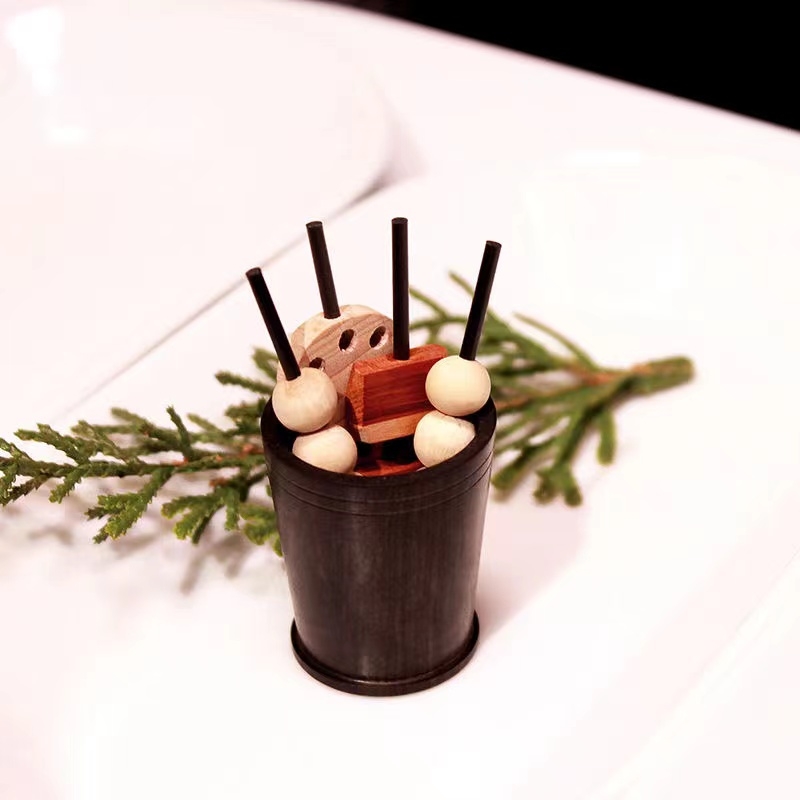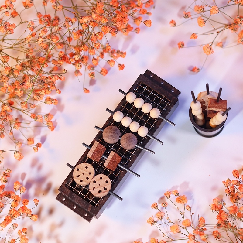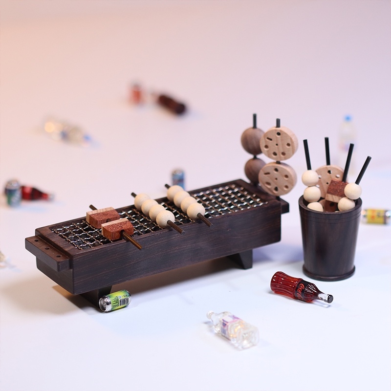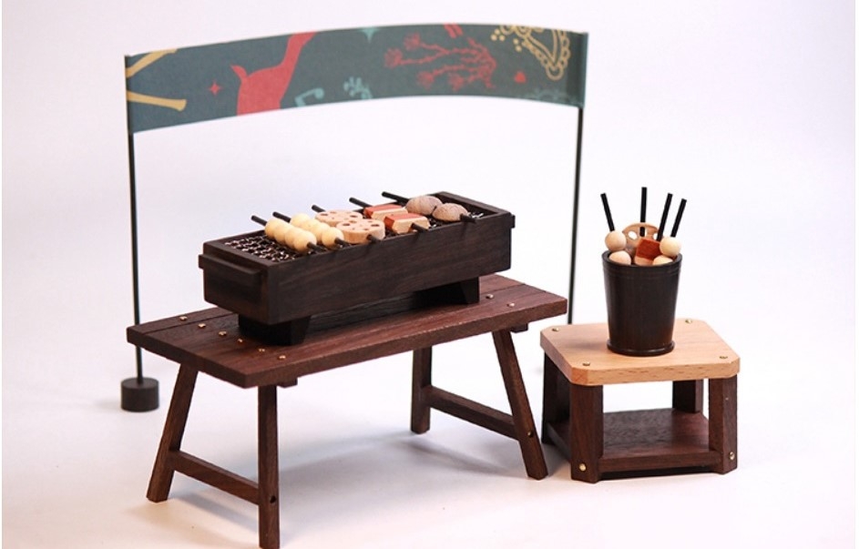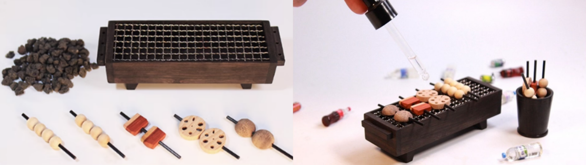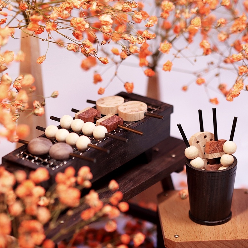 烤爐的材質還是使用顏色看起來有復古fu的「紫光檀」,在2邊有設計小洞口,滴完精油後可以先小玩一下,假裝烤個五花肉、香菇、蓮藕和丸子,接著把幾根插進旁邊的洞洞裡,隨意擺設裝飾,看起來就很有小居酒屋的感覺!