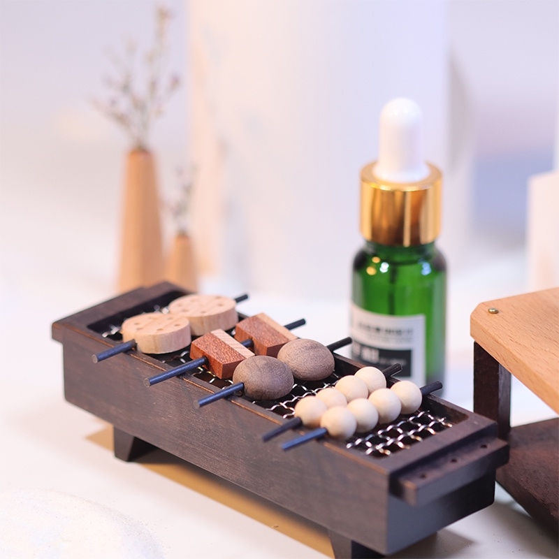 BBQ串燒擴香器設計超級精緻,不但有包含烤爐、串燒食材,還有烤食物不能缺少的煤炭!食物與煤炭分別是擴香木與火山擴香石,都能吸收精油散發香味,所以可以自行選擇想要滴在哪裡~編輯覺得滴在串燒上很像在塗醬料,看起來超療癒♡