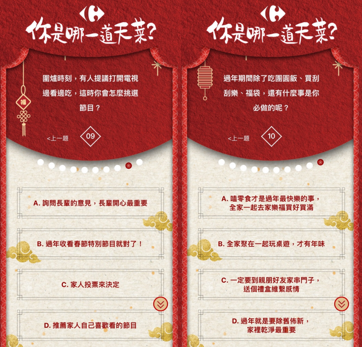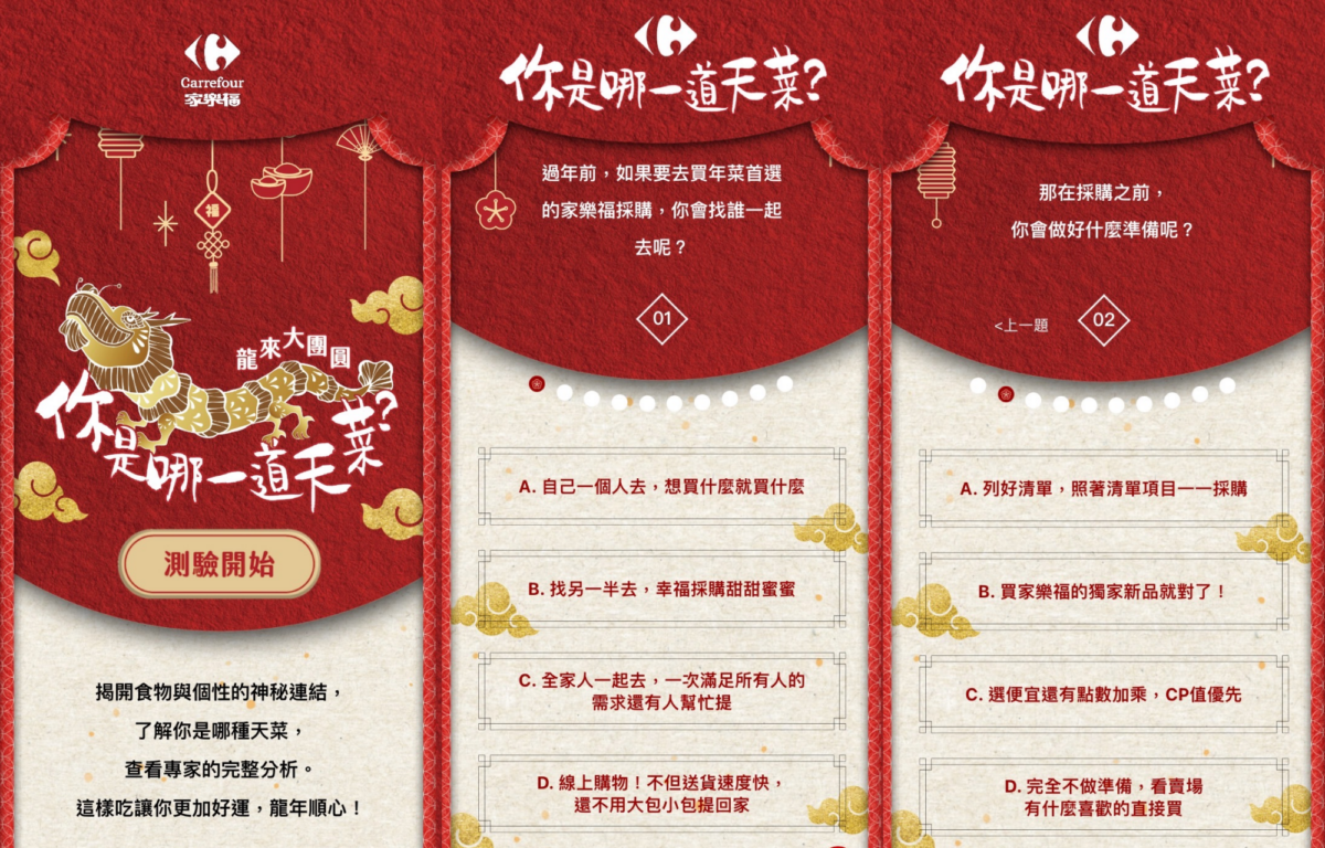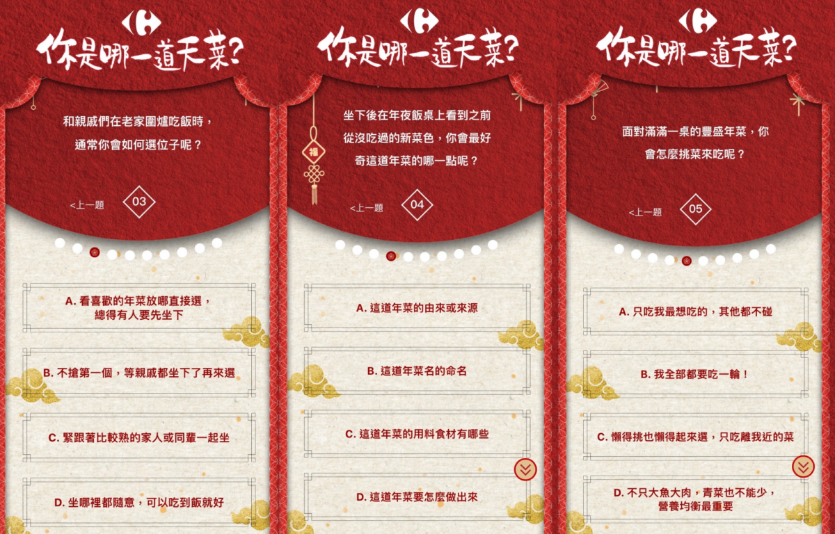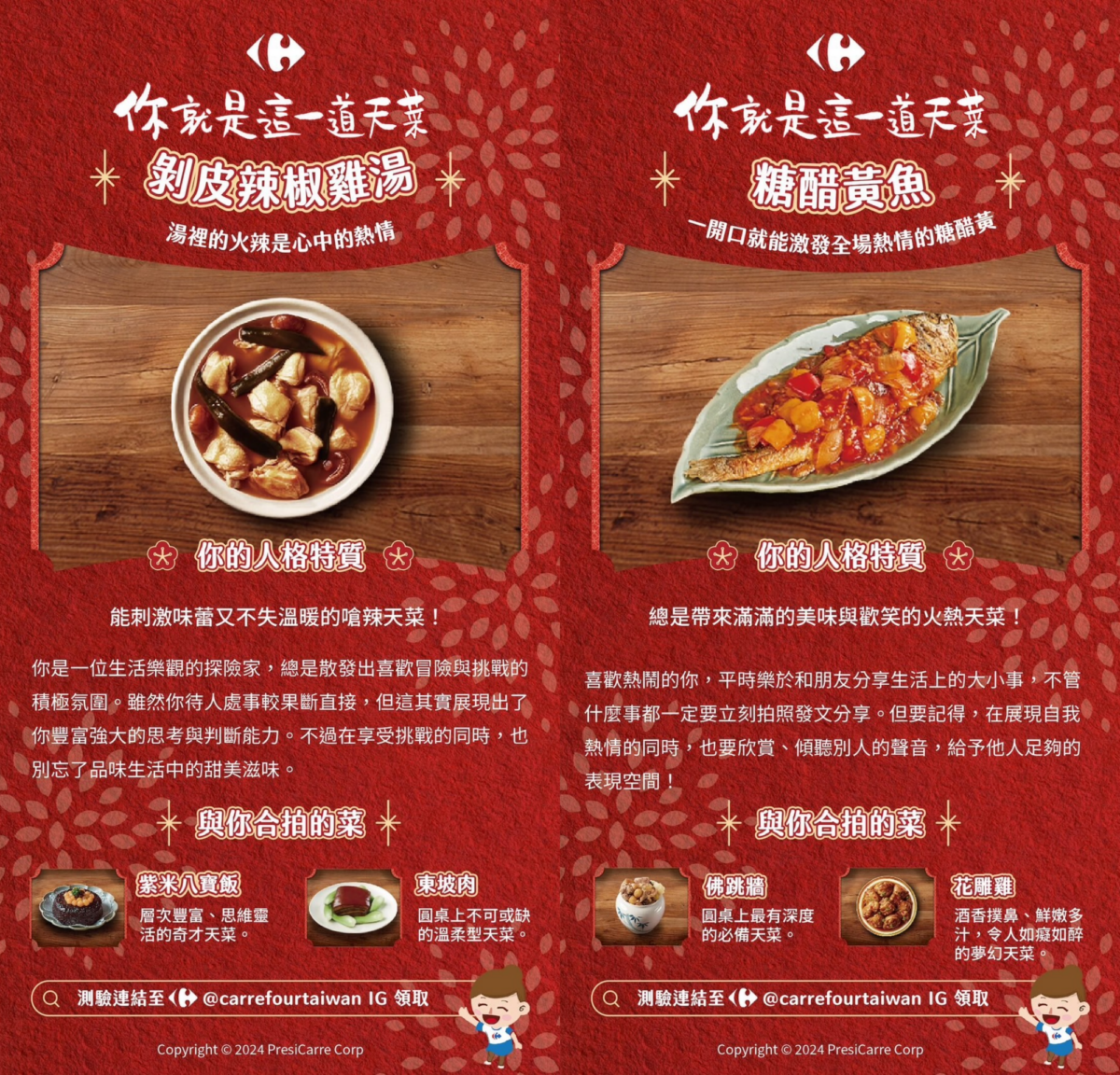 「你是哪一道天菜?」心理測驗是台灣家樂福於2024年推出的新年特別活動,以圍爐年菜為主題,不但介紹許多新年特色菜,讓大家可以決定過年要吃那些外,還將這些年菜設計成有人格特質的代表物,還邀請3位心理、能量專家一同給大家新年建議,讓你更加認識2024年現在的自己。
