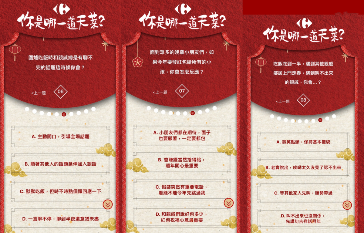 其中有些題目真的超真實,連會怎麼包小朋友的紅包、遇到叫不出稱謂的親戚都出現了XD 為了測驗的準確度,記得要乖乖回答心中真的所想的答案喔~