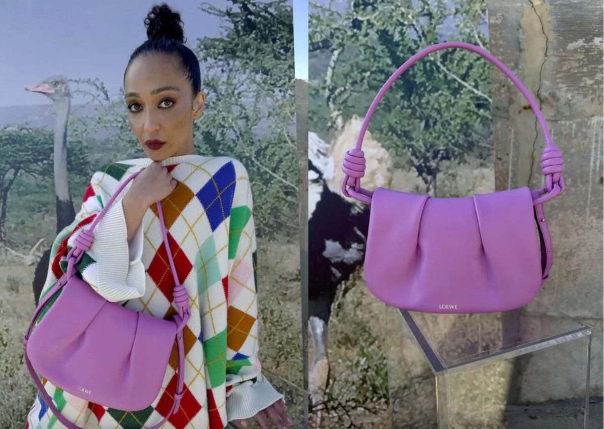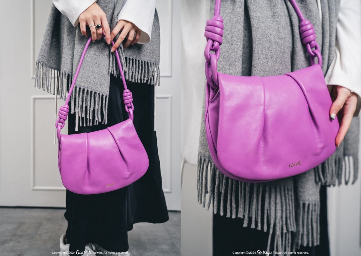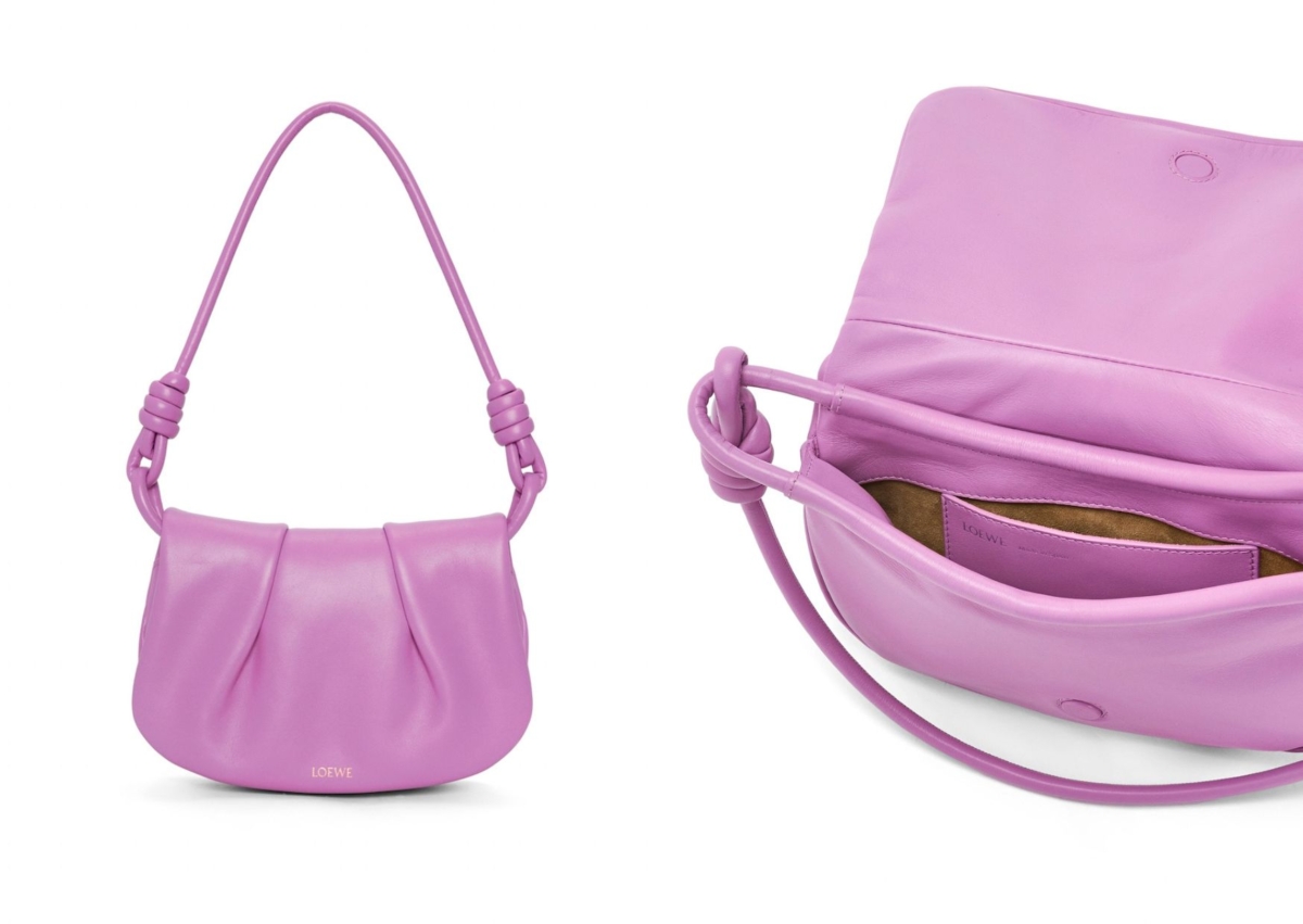LOEWE 2023 春夏系列首次亮相的 Paseo 手袋,一推出立刻受到各大名人和時髦人士喜愛,本季早秋再為這款包帶來變奏設計,推出全新 Paseo Satchel 小牛皮挎包,不僅延續了原本 Paseo 手袋猶如水餃外型的壓褶設計,整體包身輪廓也更為圓潤流暢,材質採用閃亮納帕小牛皮製成,內襯為金色絨面呈現,短把手提帶飾有 Flamenco 卷結繩結,包身正面印上金箔壓紋 LOEWE Logo,粉紅帶有紫的色調也很迷人。