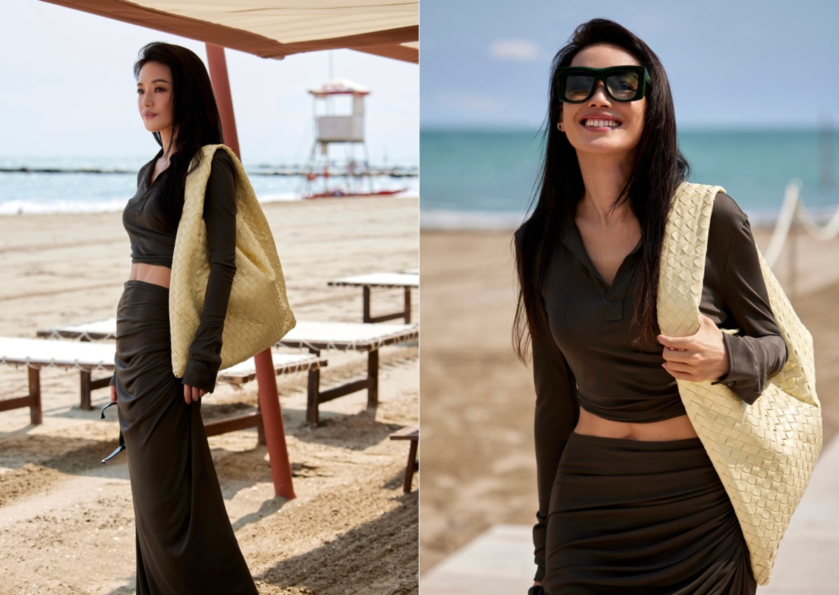 日前舒淇以評審身份出席第 80 屆威尼斯影展,換上多套時尚造型亮相,其中一套造型則來自 Bottega Veneta 咖啡色合身露腰套裝裙,揹上鵝黃色 Hop Bag 大號手袋,戴上墨鏡、漫步在沙灘上,完美詮釋出一股隨性鬆弛感美。