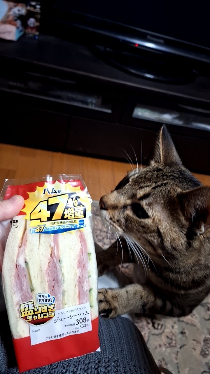 火腿三明治瞬間變超胖,加了好幾層火腿像是快要撐破包裝一樣,連網友的貓貓都被吸引(笑)。