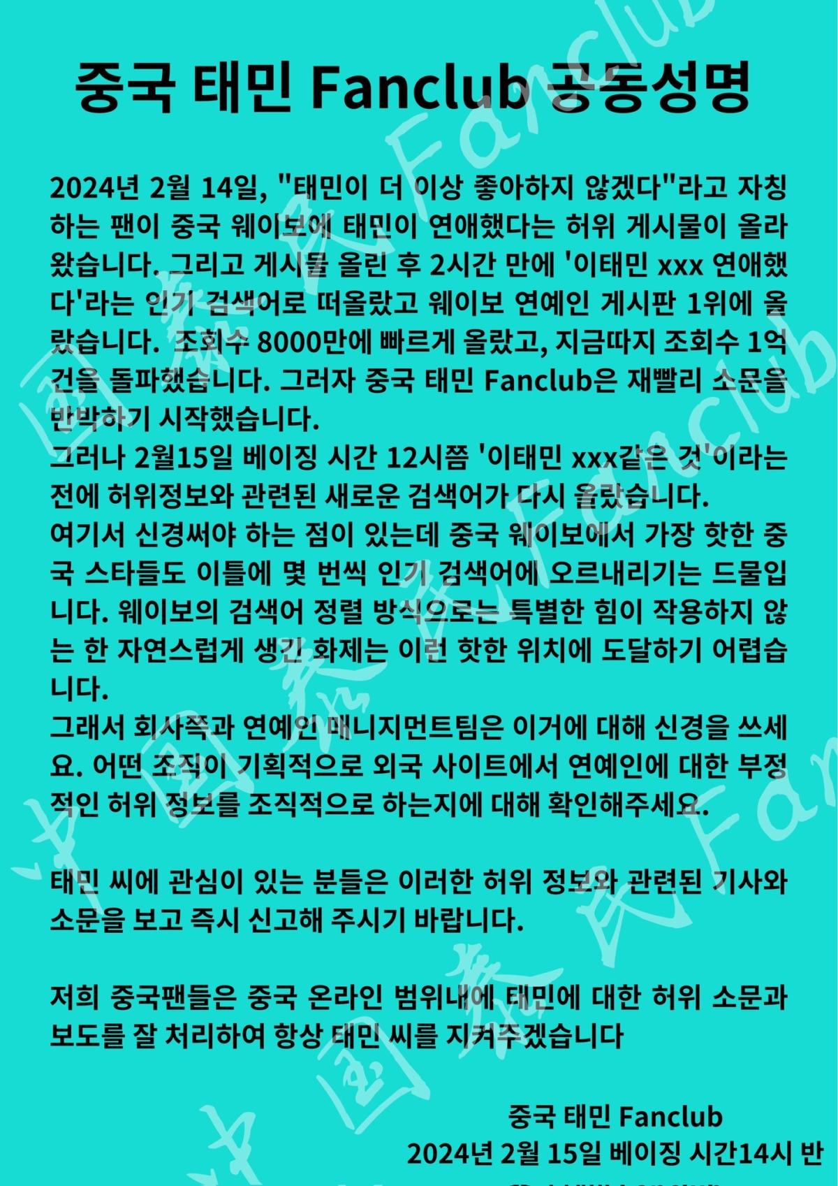 就連在中國的泰民Fanclub都忍不住公告反駁謠言,警告中國粉絲不要再散播泰民與no:ze的戀愛傳聞,並表示發現就會檢舉到經紀公司的官方系統中。