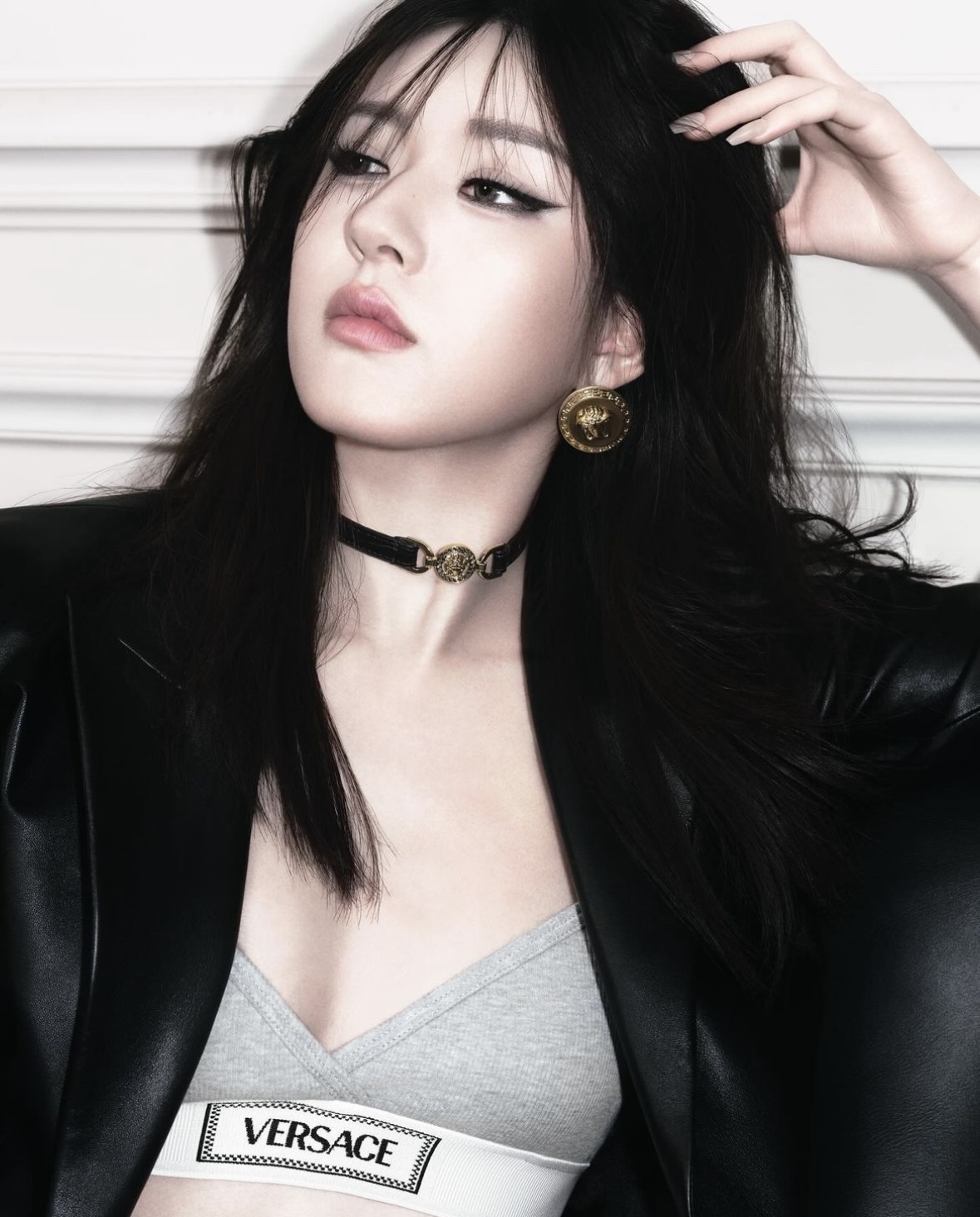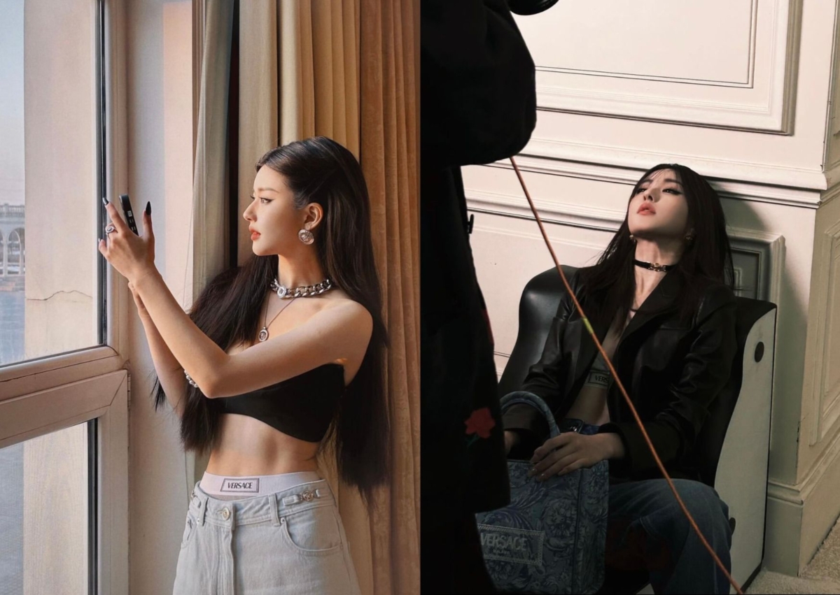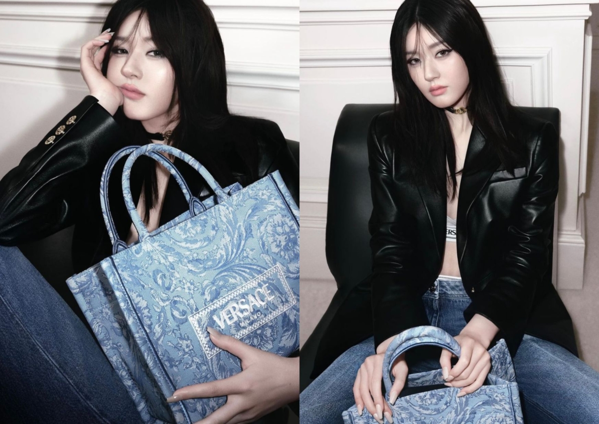 繼去年時裝週後,趙露思再度為 Versace 拍攝一系列形象照,第一套身著寬大格紋粗花呢夾克、水洗牛仔褲,內搭 LUNETTE 緊身胸衣,手拿新款 Medusa '95手提包,由光滑粒面平紋皮革製成,飾有Medusa '95 五金配件,選擇疊戴銀色頸鏈長項鍊、耳環和戒指,服裝採強烈建築感廓型,呼應臉上的煙燻妝容,一向走甜美路線的趙露思,這身酷辣風也毫無違和感。