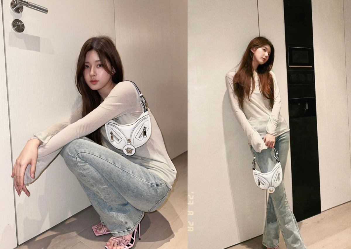 趙露思私下穿搭就經常以甜美風格貫穿,特別愛牛仔褲搭配的她,這身選擇一件Versace 粉色厚磅針織毛衣、寬版牛仔褲和米色休閒鞋作為日常穿搭,連黑色毛帽也是Versace,肩揹新款 Greca Goddess Top Handle 迷宮女神手提包,包身採米色鱷魚皮紋,斜背方式更多了一股可愛休閒感!