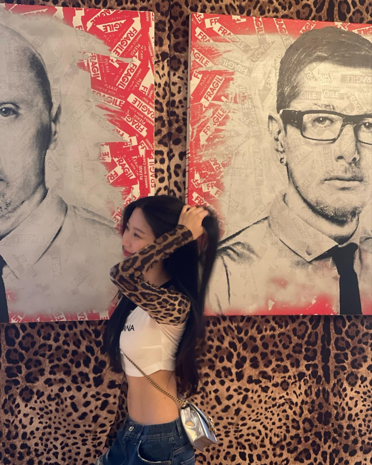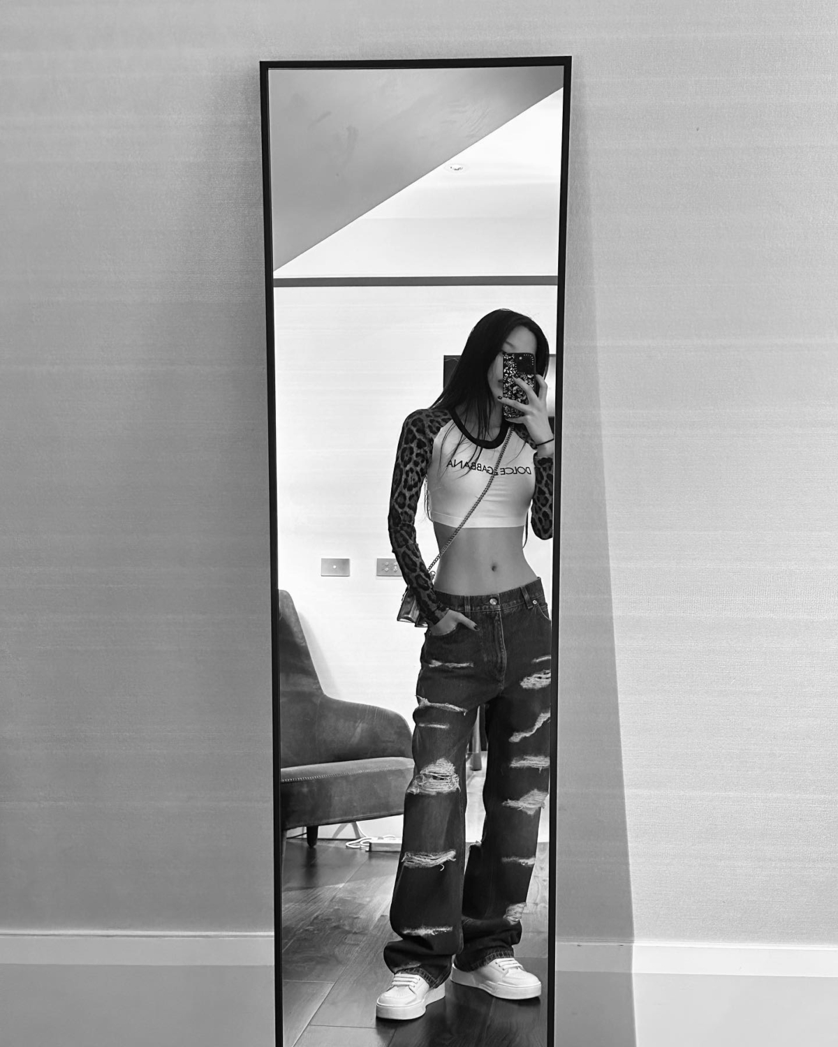 隨著Y2K潮流的重新回歸,「中低腰褲」也成為最佳的炫腹單品。擁有讓人羨慕馬甲線的文佳煐以破壞風牛仔褲搭配D&G合身的豹紋拼接長袖白T恤,既充滿個性又不失隨興態度,完美展現了她的自信品味。
