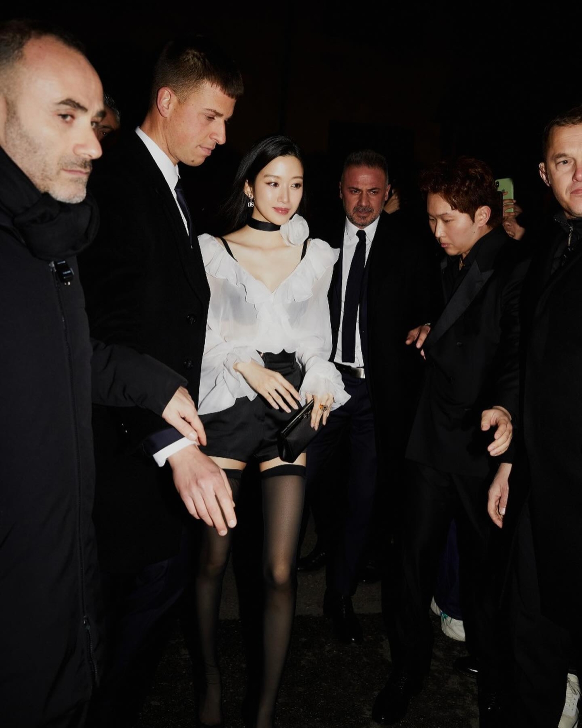 Dolce & Gabbana 2024年秋冬系列名為“TUXEDO”,以柔軟絲綢、華麗天鵝絨和精緻蕾絲結合傳統男裝結構與極致女人味的內衣融合,拆解並重新塑造出宛如藝術品並充滿力量的服飾。品牌大使文佳煐當天先以白色皮草外套搭車前往秀場,抵達之後不畏天氣地脫下外套,上身是黑色薄紗內衣,下半身則是薄紗搭配蕾絲內褲與吊帶襪,火辣的全身透視裝扮立刻成為所有目光焦點。