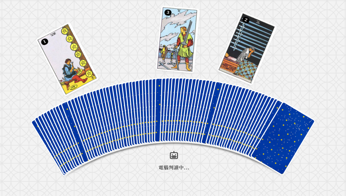 問題送出後就可以選牌啦~從78張中直覺的挑出3張塔羅牌後,畫面會顯示電腦判讀中等待最終結果。不得不說,超真實的選牌動作會上癮,讓人還想再問再抽欸XD