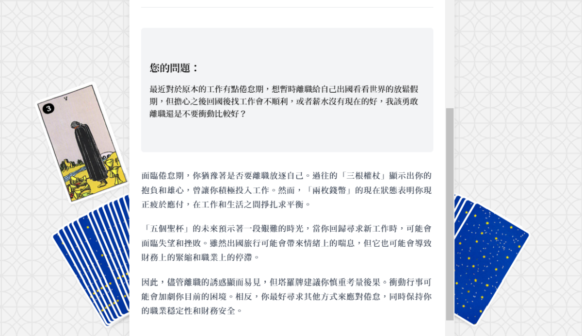 最後提醒大家,「望遠鏡塔羅占卜」僅是娛樂性質網頁,AI會嘗試將你的問題跟抽出的牌解做整合,但不代表「現實中唯一的決策依據」!如果真實生活中也真的需要幫助的狀況,還是要找尋相關專業的人士及協助喔!