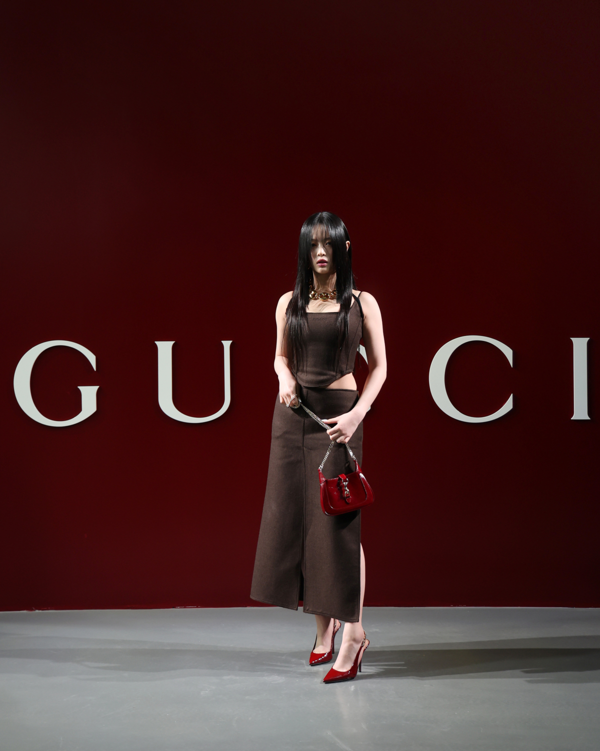 身為Gucci 品牌大使的 NewJeans Hanni 出席2024秋冬系列大秀現場啦!身穿深咖啡色露腰馬甲套裝搭配 Ancora Red 酒紅色尖頭高跟鞋亮相,手拿酒紅色 Gucci Jackie 鏈條小包,與頸間的金屬logo標誌頸鏈相互呼應,這次不同於過往的可愛甜美風格,而轉換帶有成熟女人味氣息的造型,挑戰公主切髮型也很適合她!