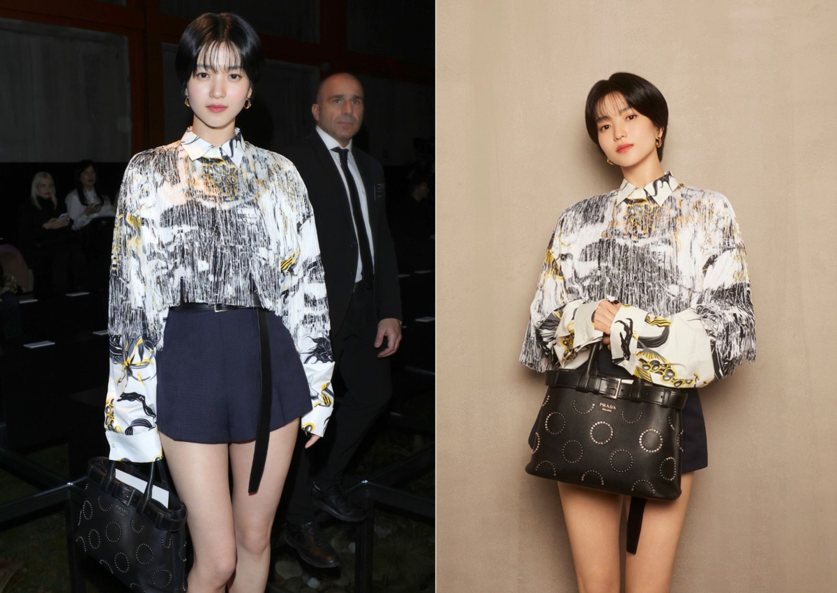 金泰梨這回選擇以個性小男孩風出席 Prada 2024秋冬系列大秀,特別與以往較知性文青氣息不同的的造型,俐落短髮新造型太好看!身穿 Prada 流蘇印花襯衫搭配黑色短褲,手提今年流行的大包 Prada Buckle 圖騰皮革連皮帶手袋,整體造型搭配淡雅妝容帶有一股80年代的港風氣質!