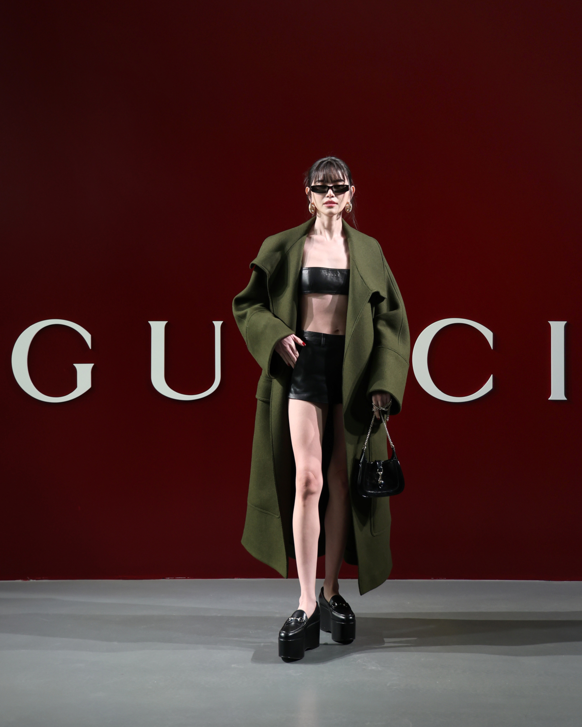 擁有「泰國第一神顏」的Davika Hoorne,同樣也身為Gucci品牌大使出席2024秋冬大秀勢必得耍辣!內搭穿著黑色皮革抹胸背心和短褲,外搭一件墨綠長版大衣,腳上穿同色黑色馬銜鍊後底鞋, 手拿Gucci Jackie 黑色鏈條包,即使是簡單的服裝廓形也很時髦,大膽露出馬甲腹肌和逆天長腿,一次穿出性感和帥氣兩種風格!