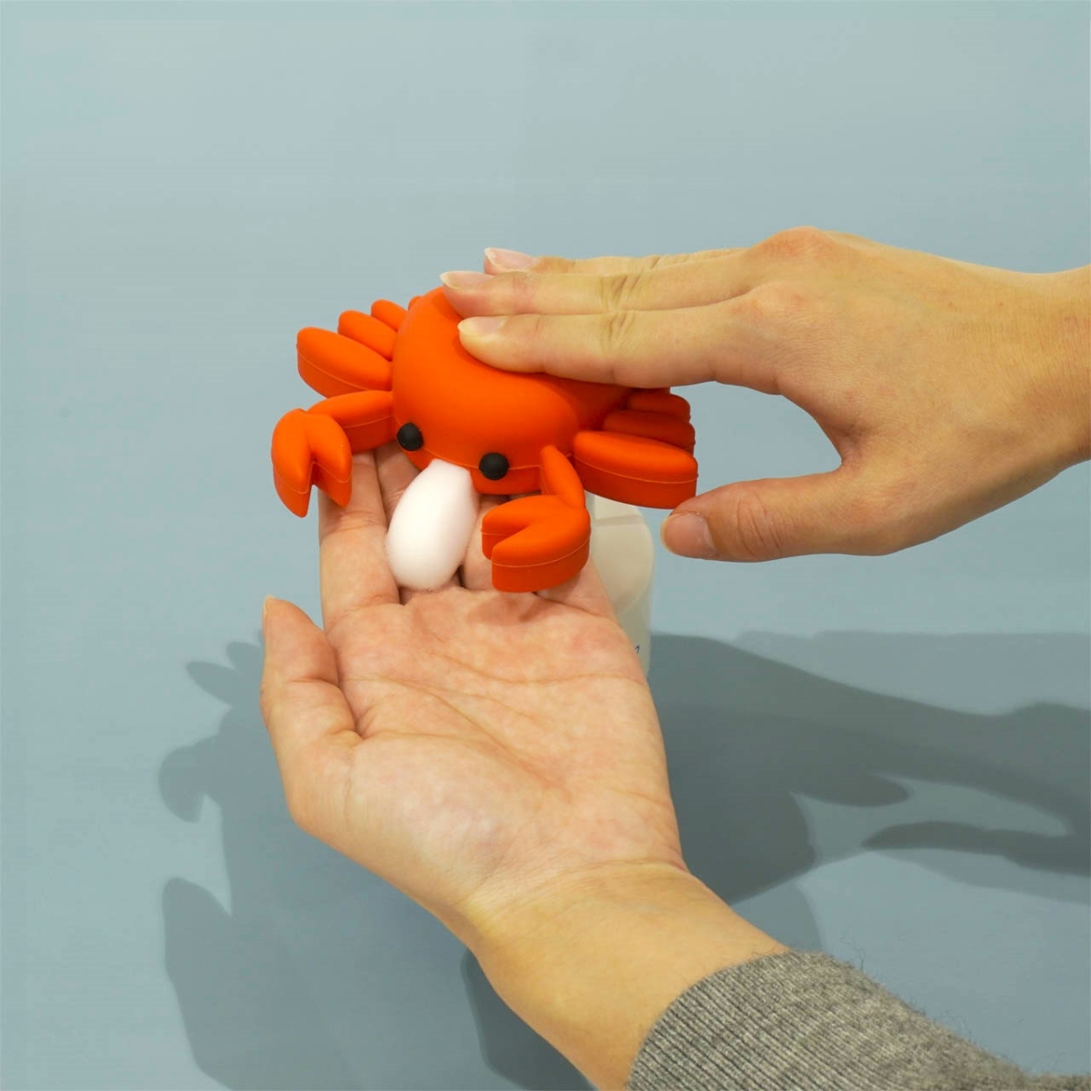 這款「螃蟹洗手慕斯」是以模擬螃蟹呼吸吐出泡泡的樣子,聯想至我們洗手的洗手乳是從螃蟹口中產出,簡單的設計卻意外讓人得有趣可愛!如此萌的設計多家長也覺得可以增加孩子們洗手的意願,因此都想購買。