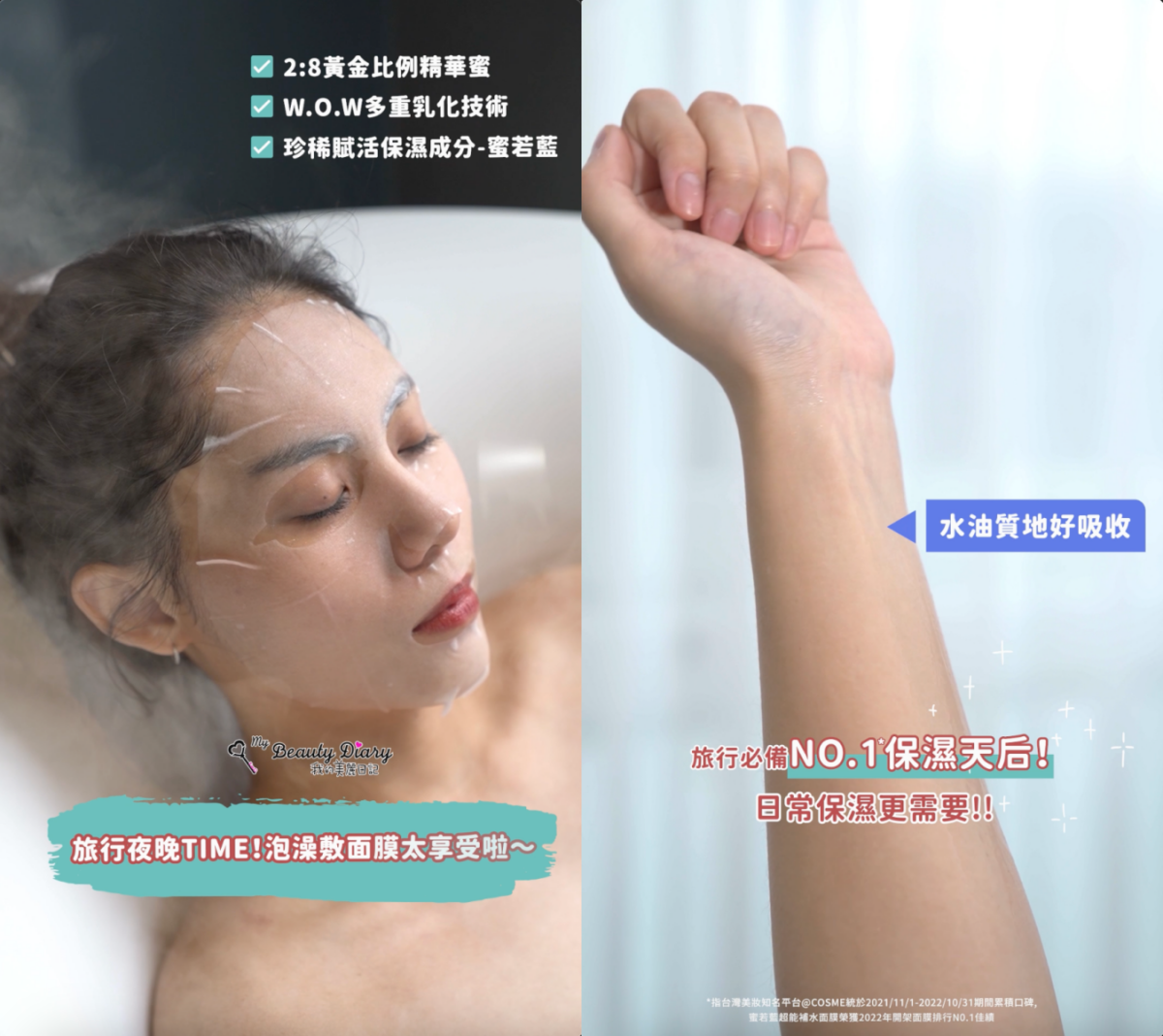 *(指台灣美妝知名平台@COSME統計於2021/11/1-2022/10/31期間累積口碑,蜜若藍超能補水面膜榮獲2022年開架面膜排行N0.1佳績)