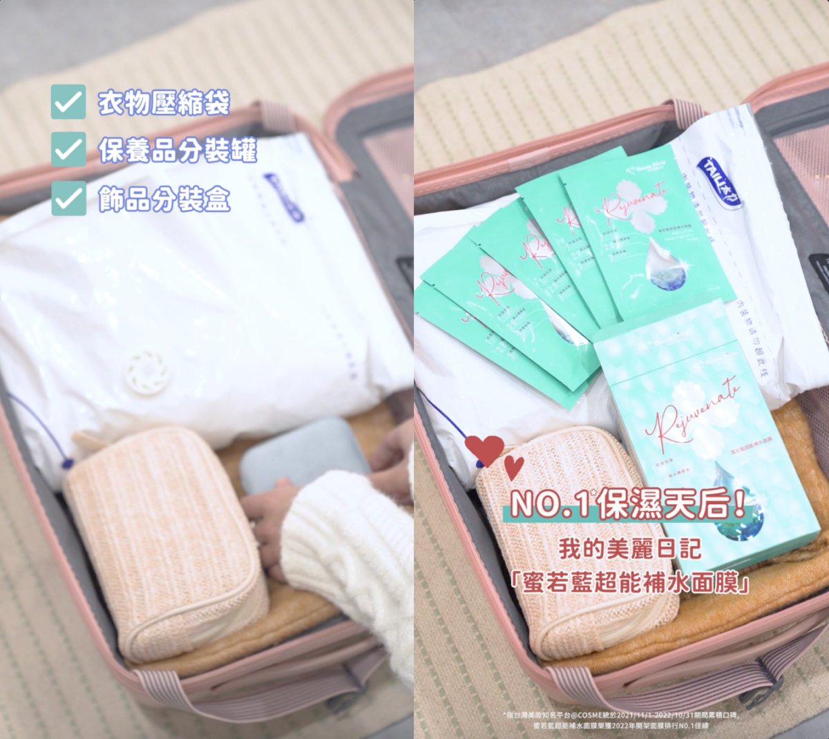 出國旅遊放鬆拍美照~整理行李也是一大學問!小編自己每一次都一定要帶上衣物壓縮袋、飾品分裝袋、保養品分裝罐等等來減輕行李重量跟空間,另外還有最重要的出國秘密武器千萬不能忘,那就是開架面膜熱賣王、我的美麗日記「蜜若藍超能補水面膜」!