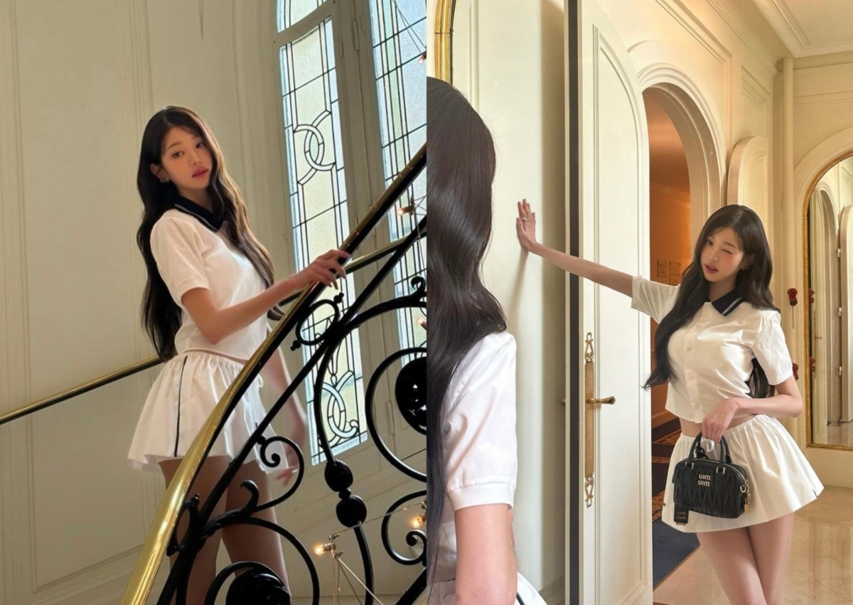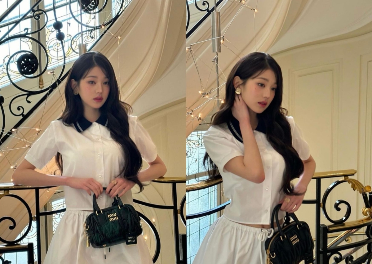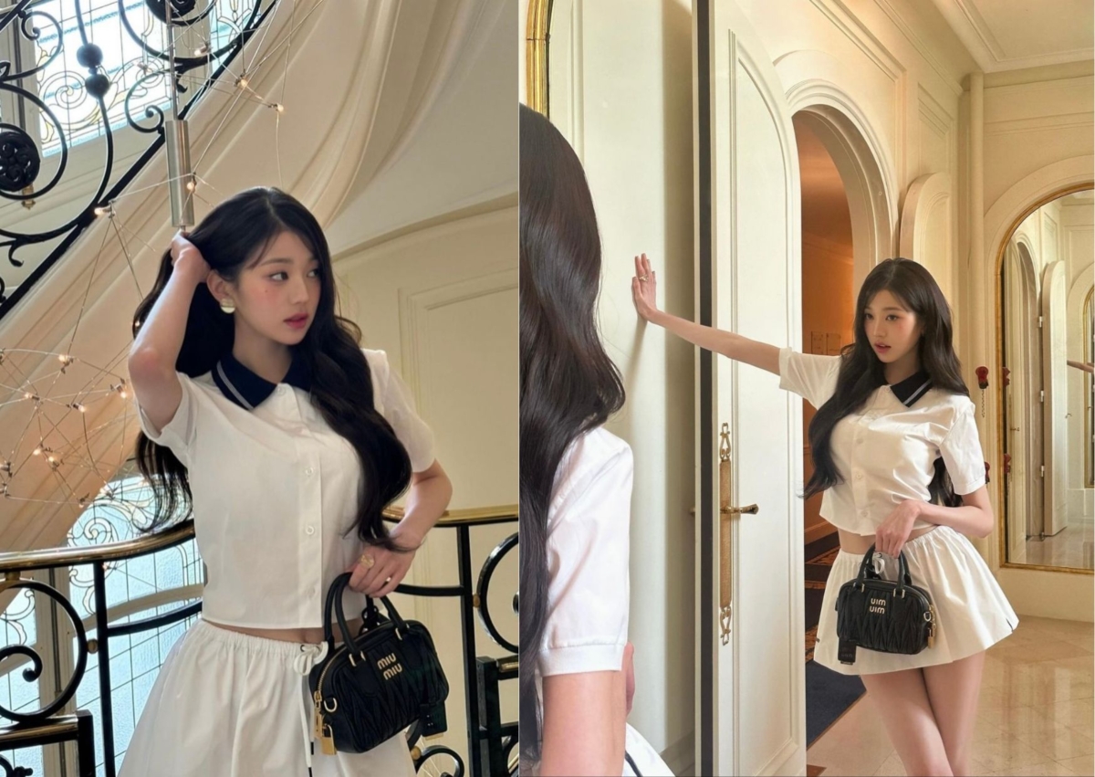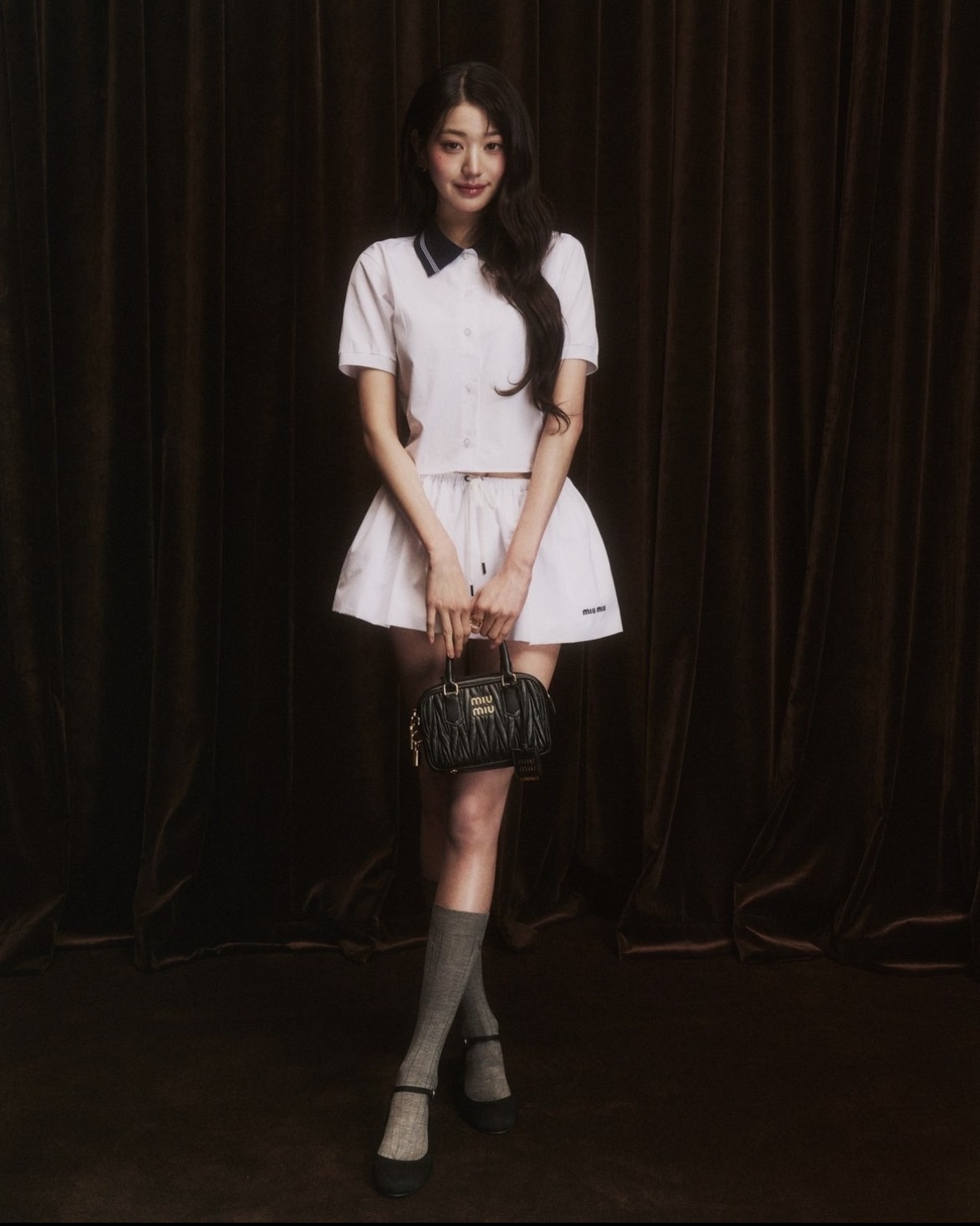 身為 Miu Miu 品牌大使的 IVE 張員瑛勢必是時裝周大家最注目的焦點!這次不同於春夏時裝週穿的那麼華麗成熟千金感,反而以青春、充滿活力的樣貌登場,穿上Miu Miu 超新款白色水手服套裝,目前尚未發售,搭灰色中長襪、2024春夏系列的瑪莉珍皮鞋,手拿Miu Miu Arcadie 納帕皮革黑色手袋,以經典的 matelassé 工藝為特色,配以肩帶和細緻的金屬飾件,小巧卻超精緻,整體造型讓人看得心癢癢、既可愛又迷人!