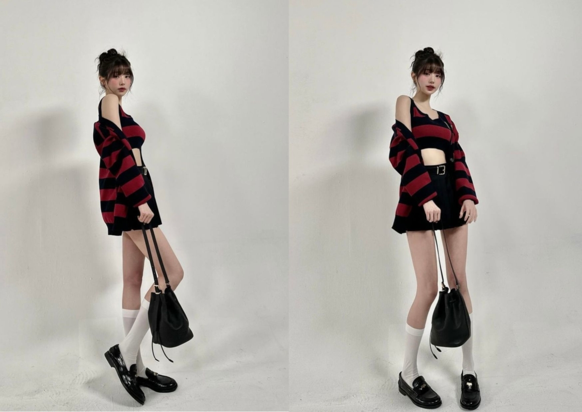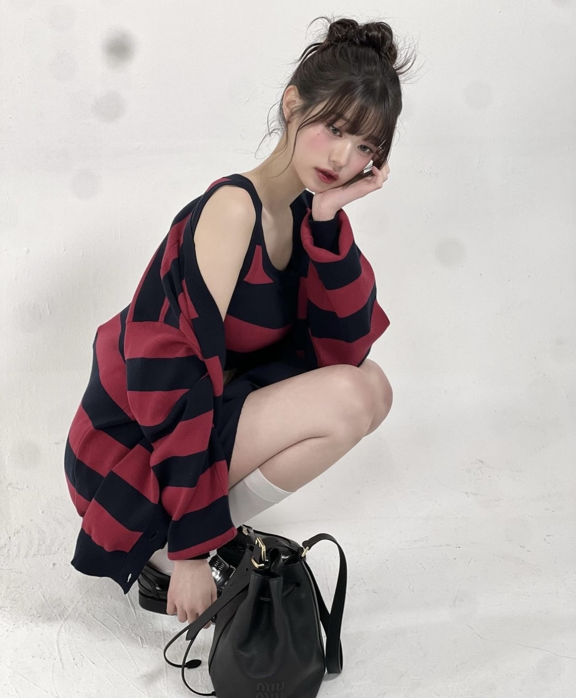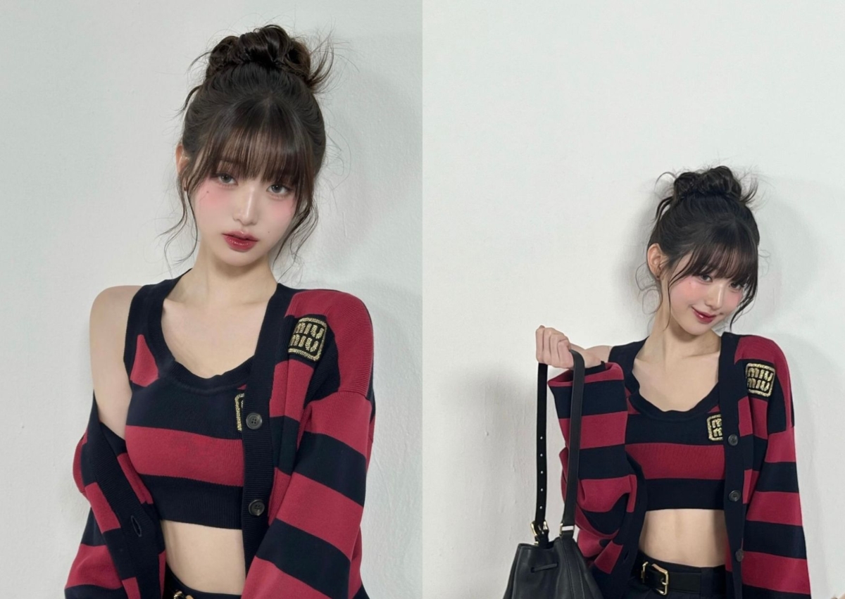 張員瑛搶先在看秀前在社群上釋出美照,這款純欲甜辣造型感實在太適合她!穿著 Miu Miu 2024春夏系列學院風紅黑條紋混紡針織背心、開襟衫、迷你百褶裙,繫上寬版皮革腰帶更顯腿長,白色中長襪搭黑色漆皮鞋也是學院風標配,包款也選擇 Miu Miu 2024春夏款 Bucket Bag,綁起包頭造型,視覺年齡立刻減十歲,張員瑛的眼下腮紅妝也是一大重點!