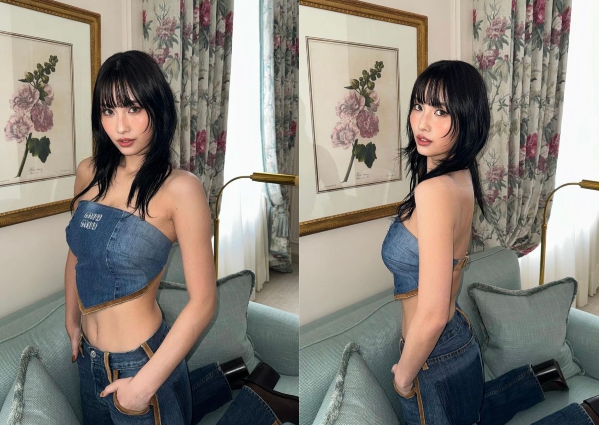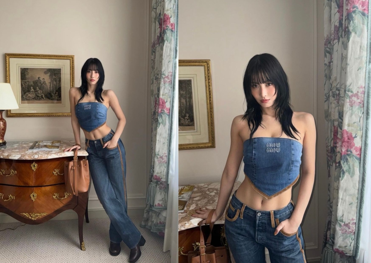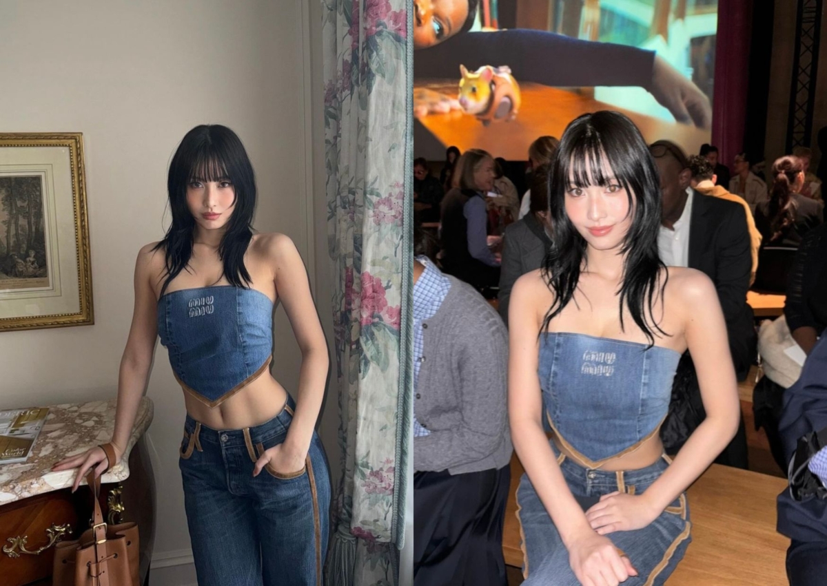 本場時裝秀最辣的 Miu Miu 女孩非 TWICE Momo 莫屬了!上回出席春夏時裝週以深色包臀裙搭黑絲襪現身,這回同樣辣度破表,穿上 Miu Miu 2024 春夏系列牛仔平口上衣,同款牛仔寬褲搭咖啡色短靴,正面秀出腹肌馬甲好身材,一轉身大露背辣到不行,搭配頭髮層次俐落羽毛剪,穿出春夏活力又性感的氛圍,整體時髦度更提升!