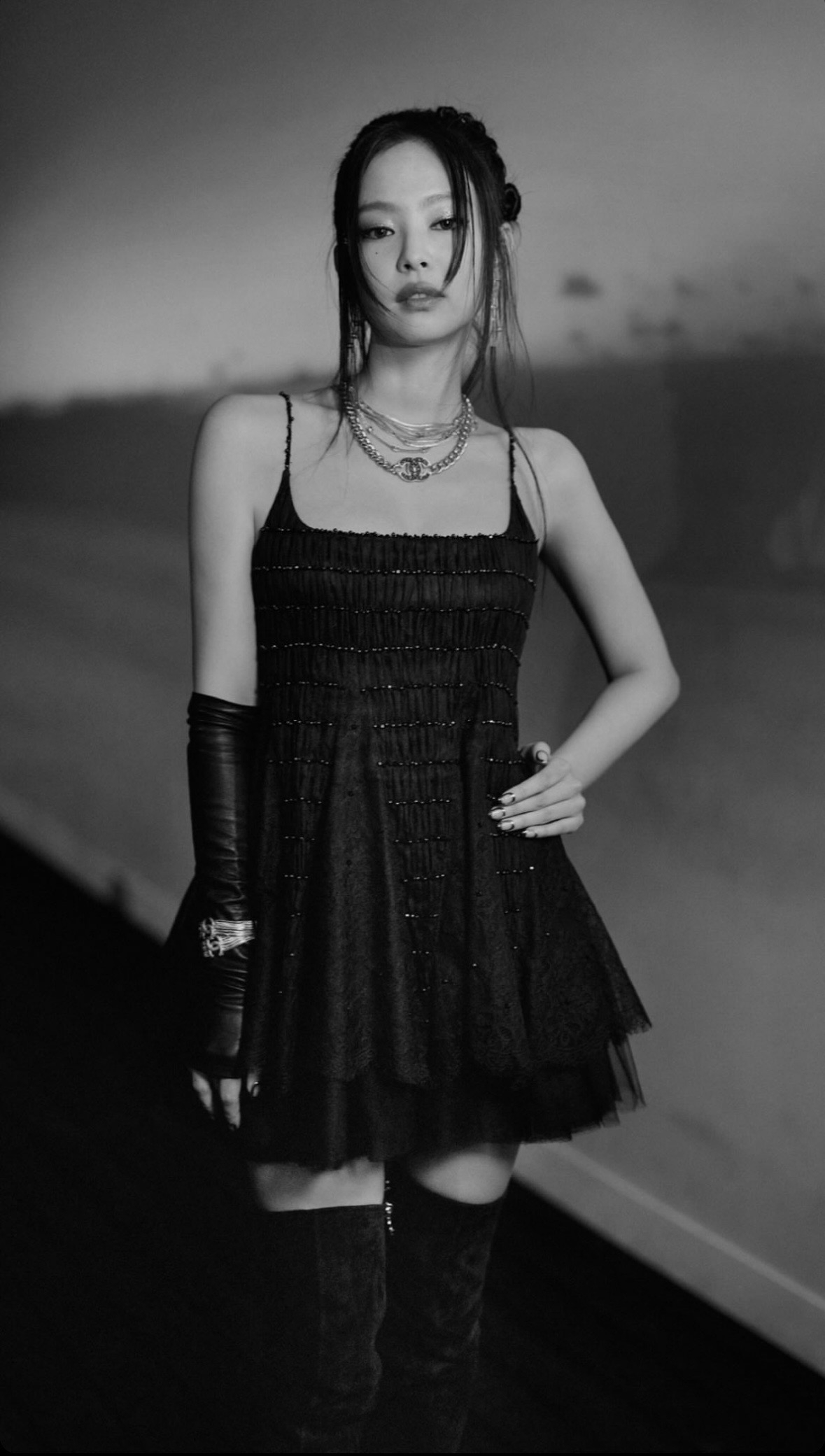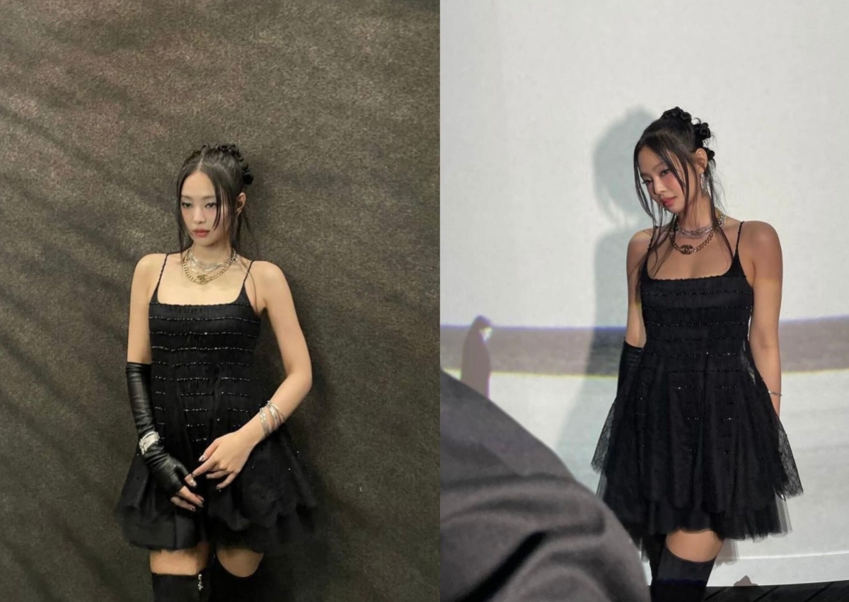 這件蛋糕小洋裝整體看似甜美,但選擇搭配大LOGO鏈條項鍊、單隻皮手套和過膝高跟靴,瞬間為造型增添了又酷又性感的迷人魅力,簡直是集帥氣、火辣和可愛於一身,果然什麼風格都難不倒 Jennie!