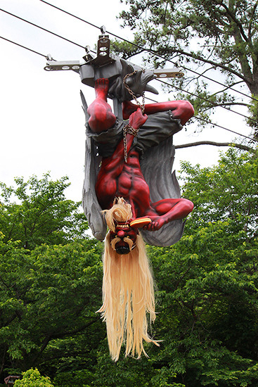 同樣許多慕名而來觀看的也有這隻「天狗」,它會每隔15分鐘突然從旁邊的小屋子裡「碰」一聲的倒掛飄在空中,全身紅通通巨大強壯的樣子有時會嚇到拍照的遊客。不過只要仔細發現它手上拿著的是它最愛的「銅鑼燒」,瞬間就不可怕了XD