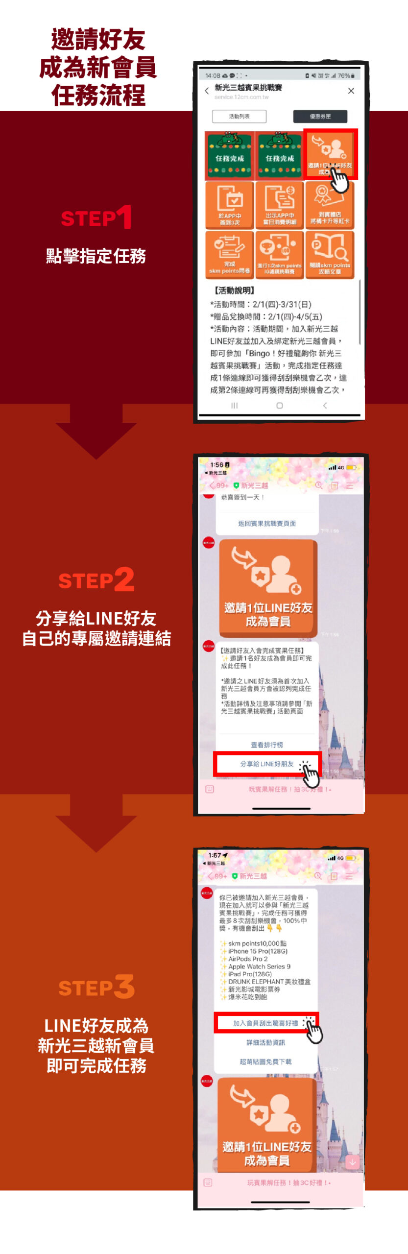 要特別注意的是,邀請的好友必須為「新會員」(即未曾申辦過新光三越會員的好友),且必須是「透過邀請連結成為會員」才能算完成任務哦!