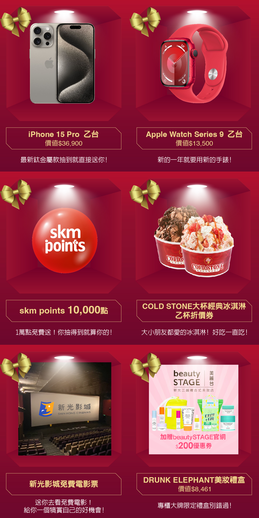 ☑️100%中獎率,每人8次抽獎機會,有機會可抽中8台APPLE系列產品、專櫃近萬美妝禮盒、10000點skm points可在新光三越折抵消費或兌換/抽獎等等!