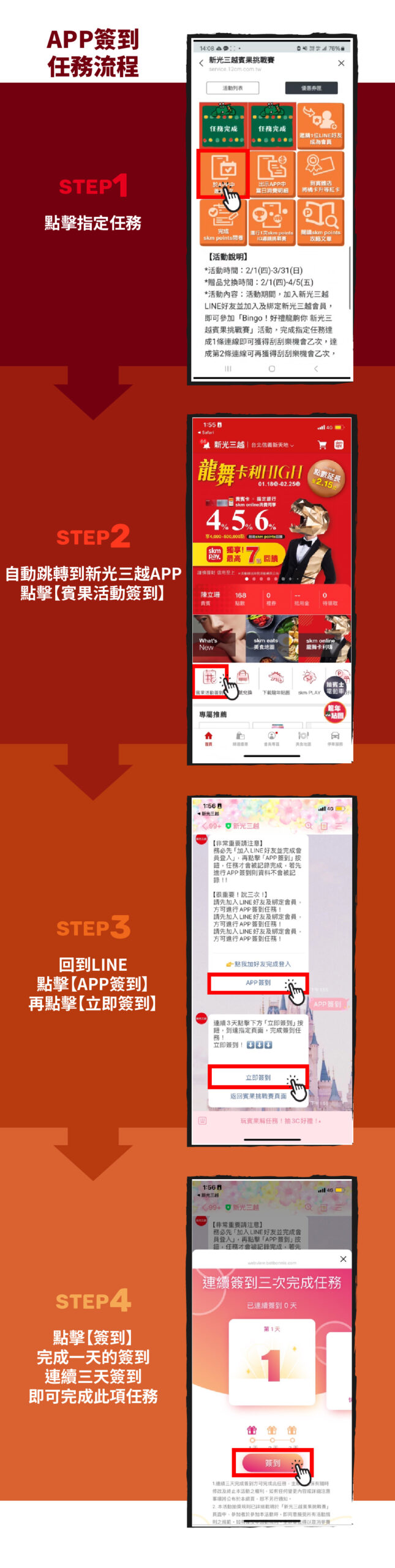 只要連續3天簽到即可!下載/打開新光三越APP,找到「賓果任務簽到」按鈕,即可跳轉回LINE進行簽到步驟,但記得每天要回來簽到哦~