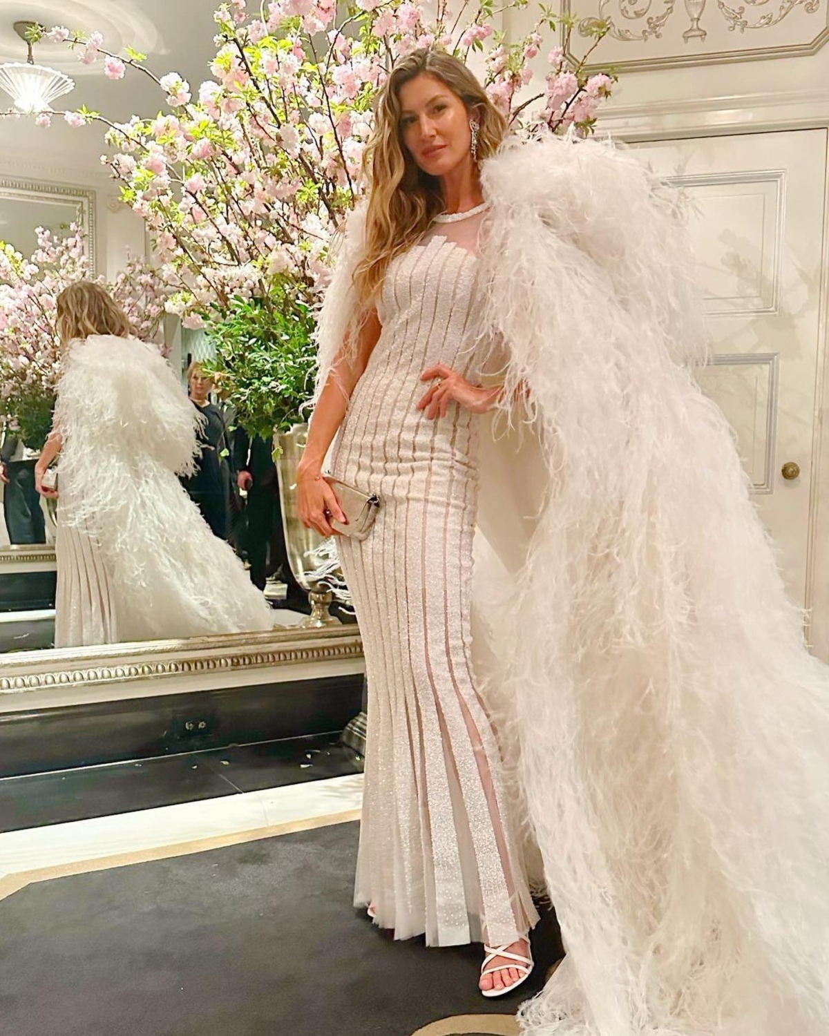 巴西超模吉賽兒邦臣 Gisele Bündchen 在以「老佛爺」Karl Lagerfeld 為主題的 Met Gala 紅毯上,穿上過去曾演繹過的 Chanel 2007 春夏系列的高訂禮服,由水鑽縫製而成的條紋禮服,搭配氣勢滿分的純白羽毛斗篷,妝容不只輕透有光澤,整體造型宛如仙女降臨!