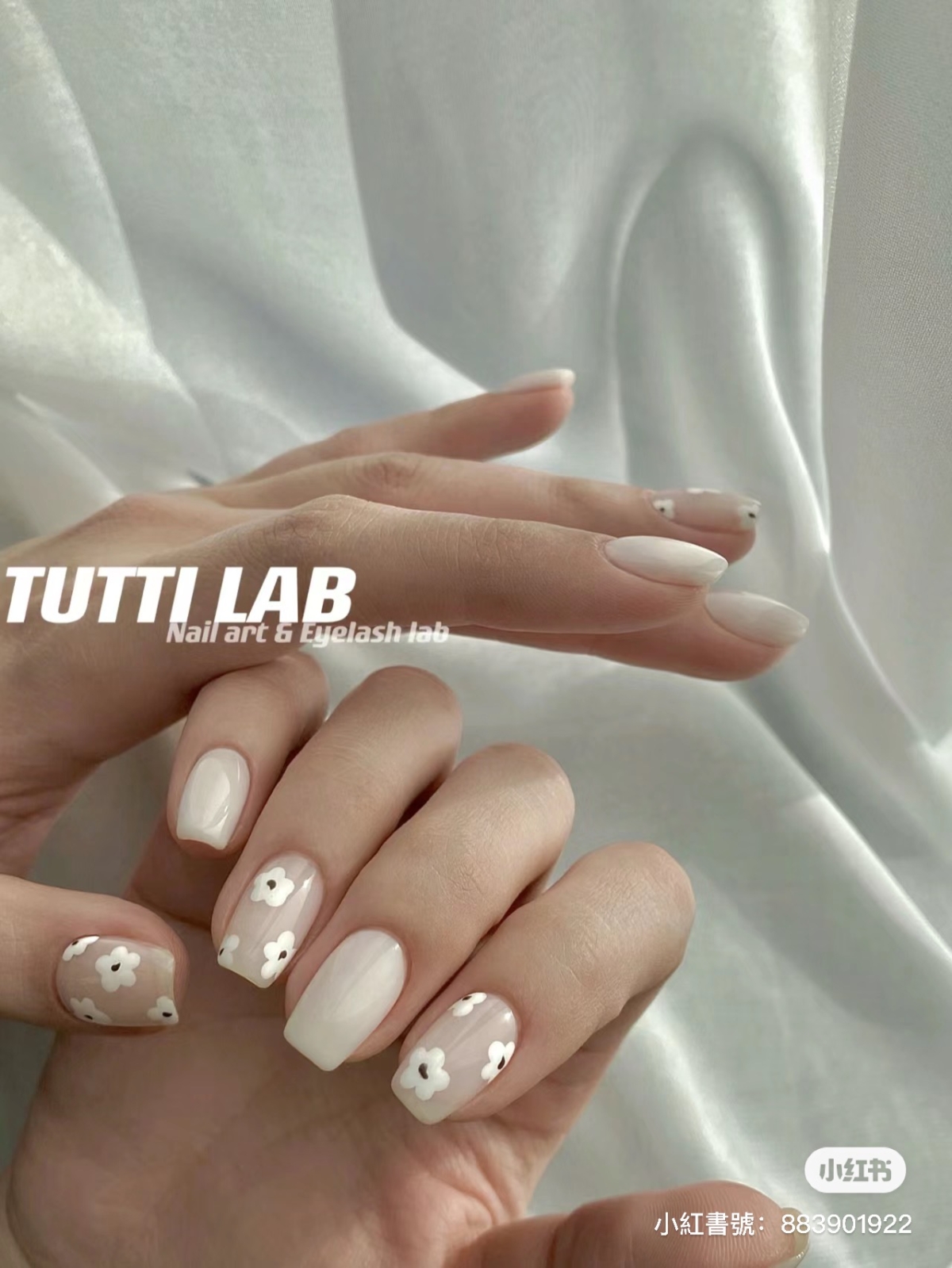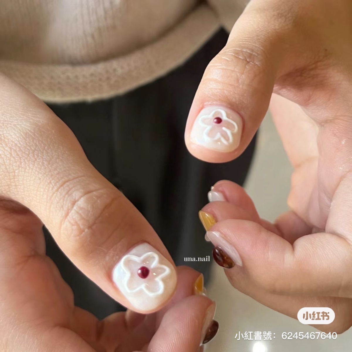細緻的花朵圖案總是能給人一種清新自然的感覺,搭配在白色美甲上更能展現出簡單而精緻的風格。低調百搭的款式適合各種場合,不管是日常的休閒穿搭還是正式場合,都能展現出既柔美優雅又不失少女心的可愛感。