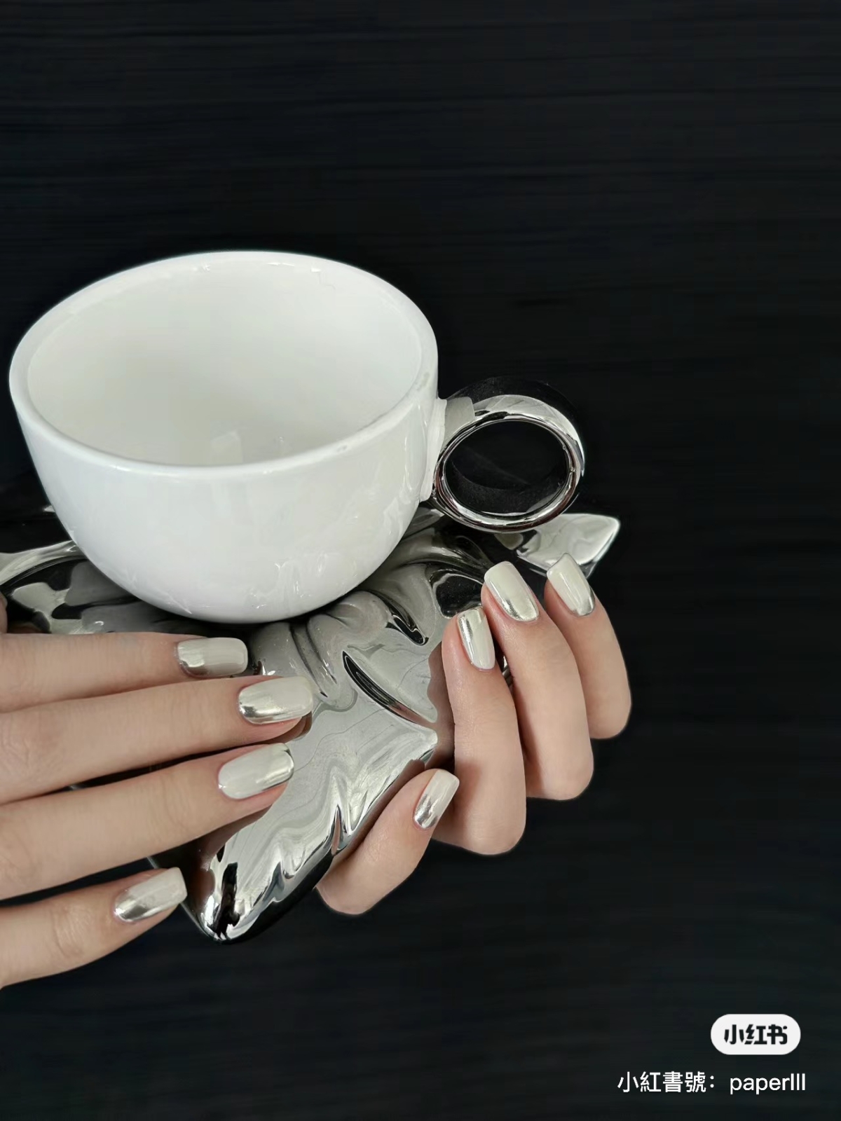 將白色底色與金屬質感相結合,可以帶來意想不到的時尚感!在指甲上塗抹上一層白色底色後,部分位置添加金屬質感的紋路或點綴,讓整個指尖散發出風格強烈的對比,個性女孩首選款!