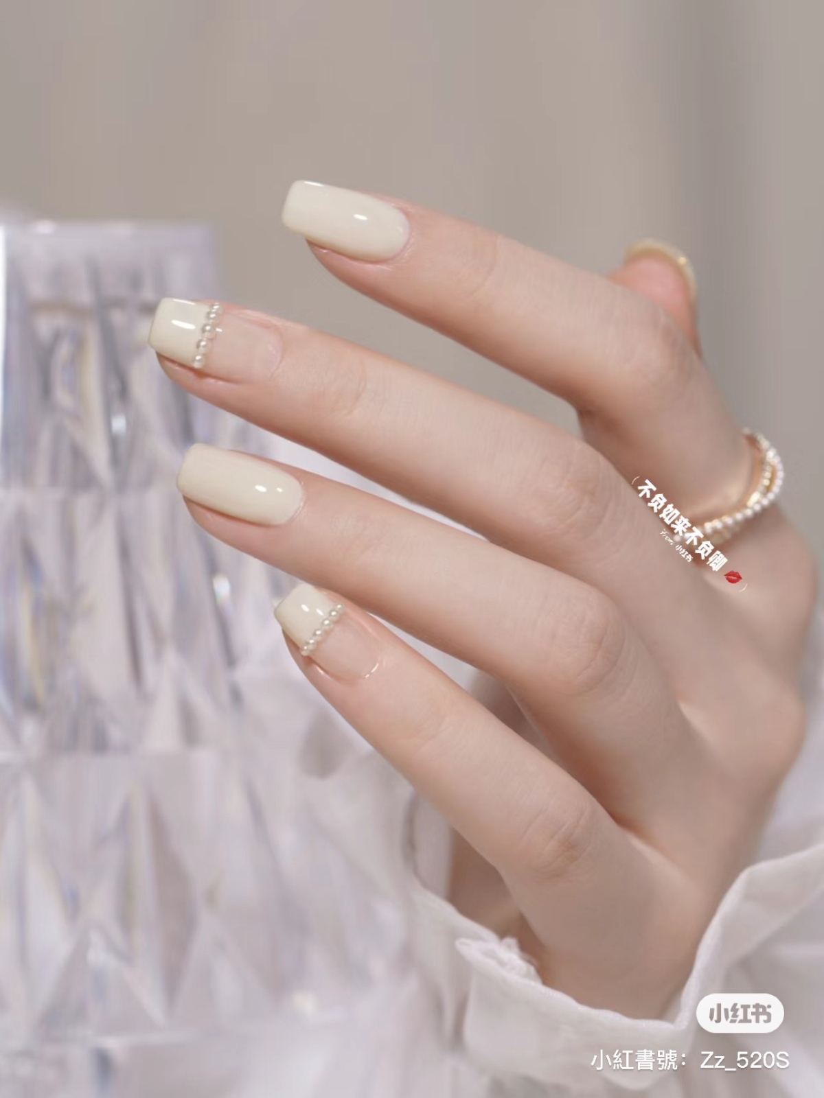 法式女孩必備款!簡單而精緻的美甲設計結合了純白色調和珍珠元素,營造出一種優雅的氛圍感,舉手投足都多了一份法式的優雅和慢活。也可以請美甲師用大小不一的珍珠打造更有層次的效果,在不同角度中透過光線折射出不同的低調光芒,讓指尖自帶閃爍 。