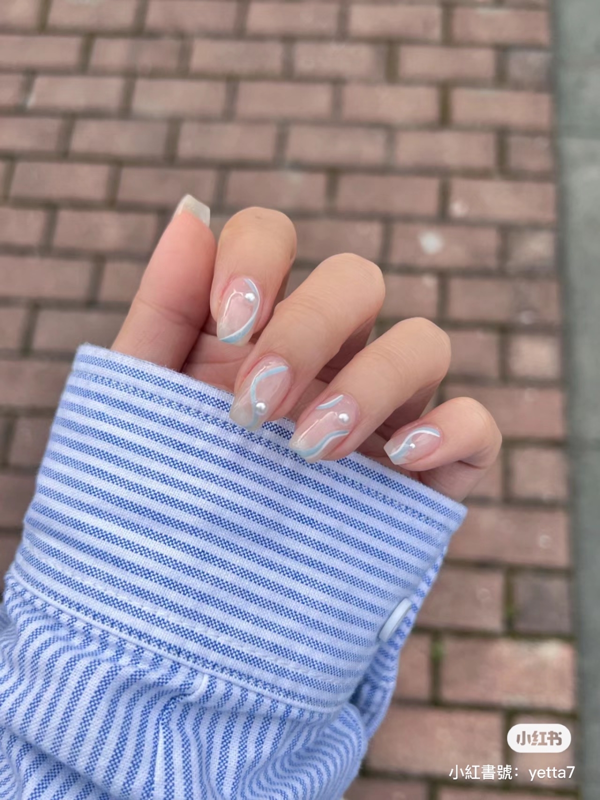 韓系女孩喜歡的輕透感也可以搭配條紋美甲做呈現唷!以透明藕粉當作底色,讓甲面更乾淨自然,畫上水藍色的變形條紋比起直條紋的復古可愛,流動的線條更多了一股優雅魅力。