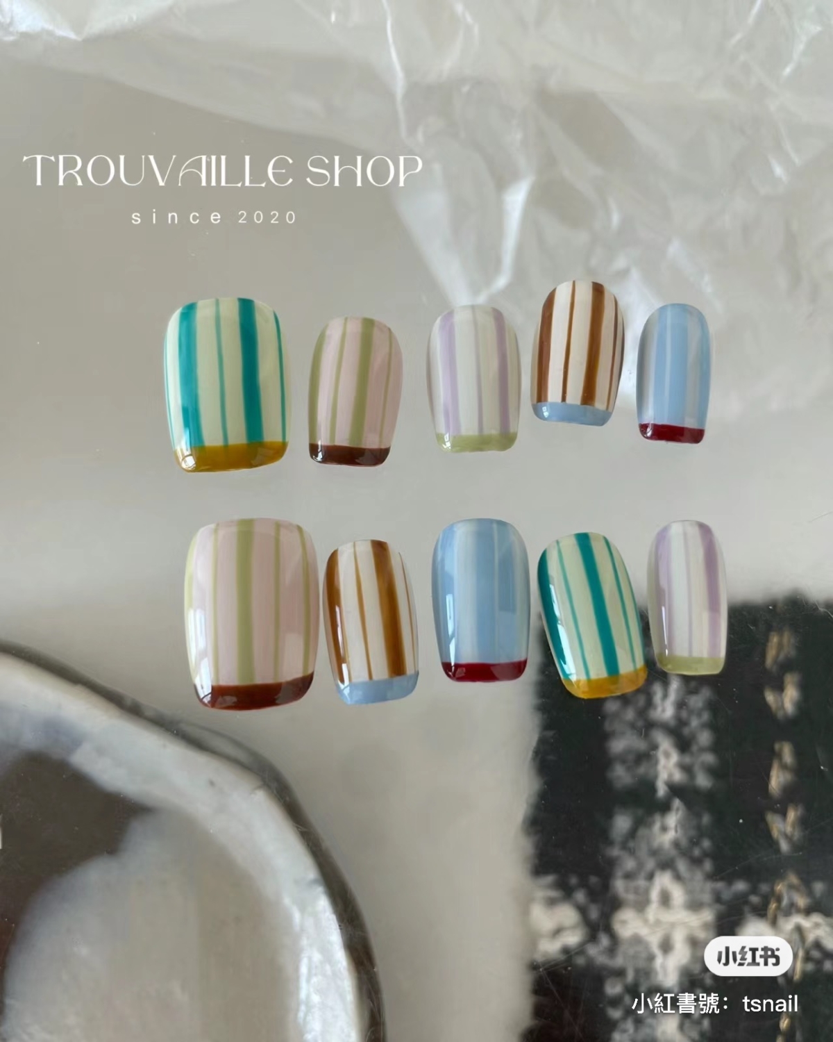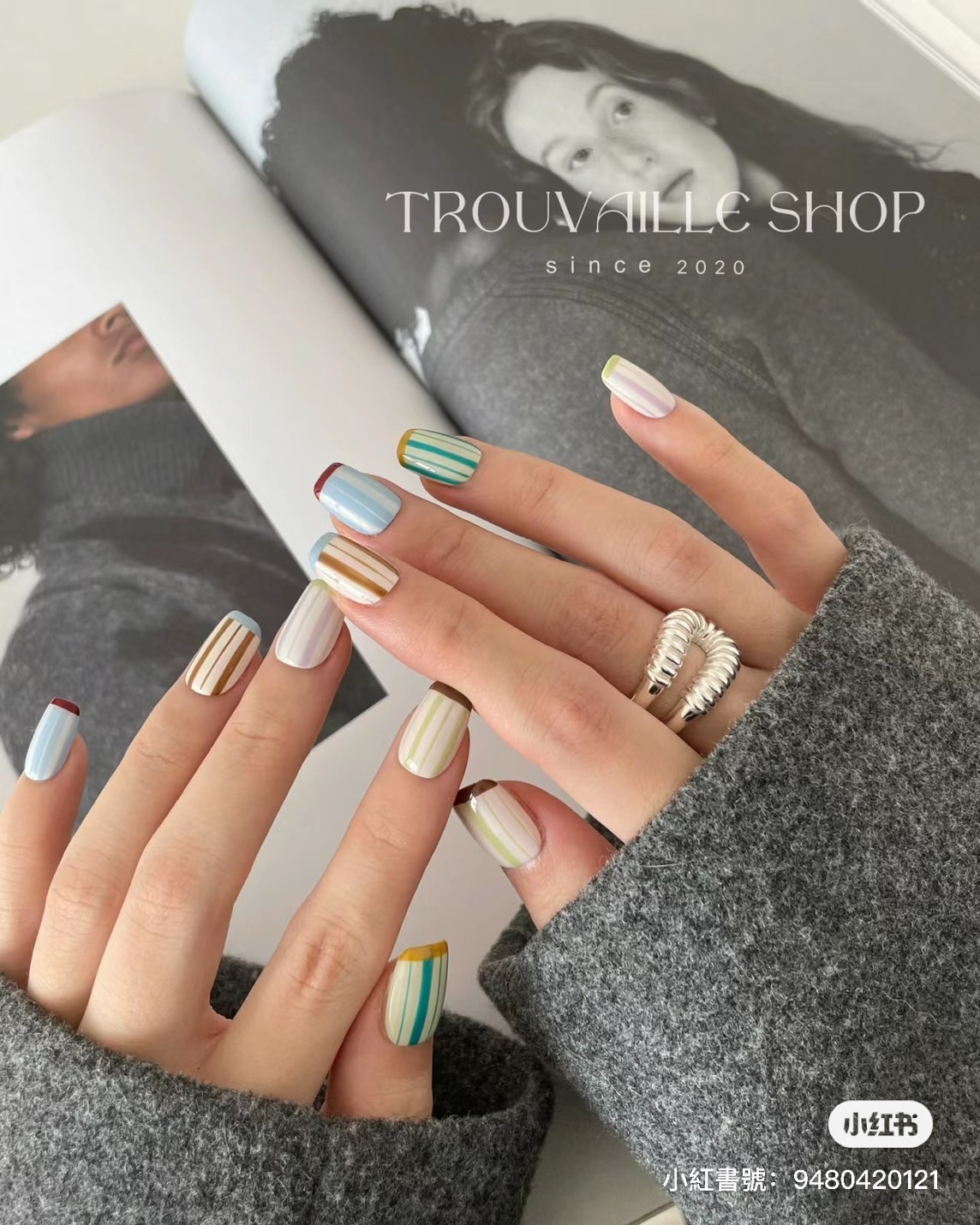 條紋與復古幾乎是零失誤的搭配法,這款充滿美式風格的復古條紋美甲以各種低飽和色作為定調,並搭配奶油白的底色打造視覺的合諧感,讓整體美甲的風格更加鮮明外,也不容易視覺疲勞(超級耐看)。以粗細不同變化的條紋呈現,讓經典的條紋線條有了不一樣的新變化,只能說條紋真的是永遠不敗的經典呀!