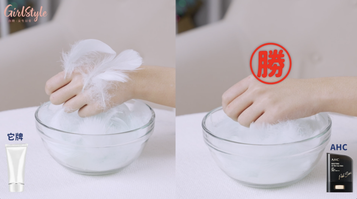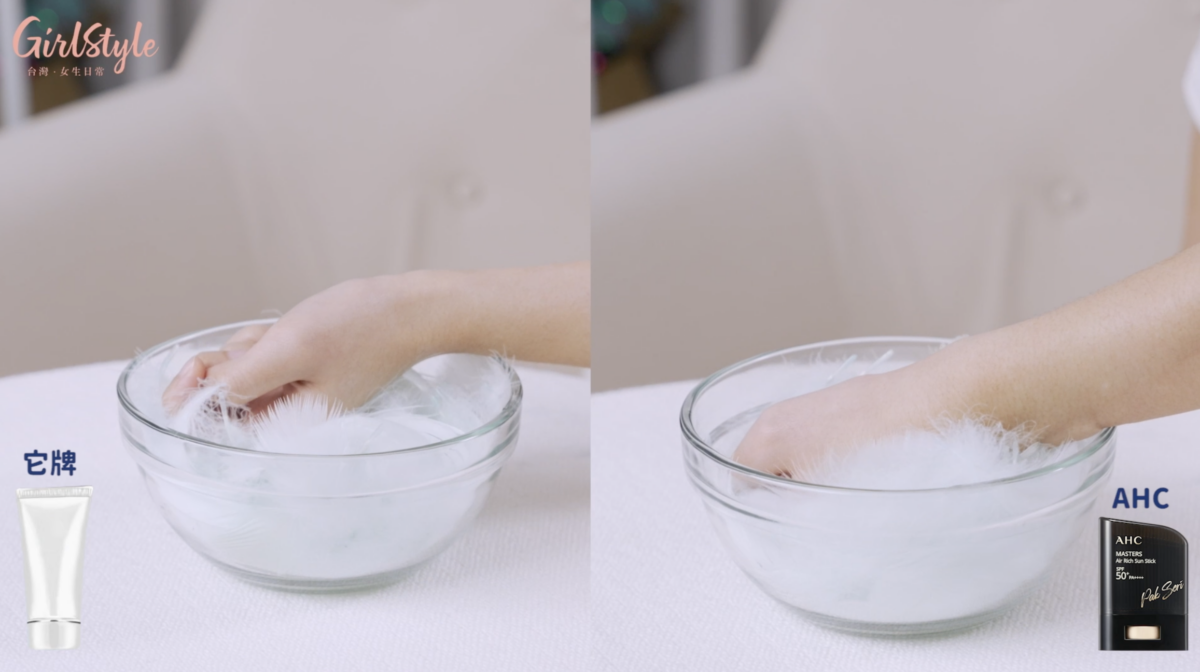 手上分別塗抹上他牌防曬乳和小黑盾防曬棒,小黑盾不只塗抹的時候非常清爽,各位看看這些羽毛根本沒辦法靠近小黑盾,這不黏膩的程度,已經直接加入戶外小天才必備清單中惹!