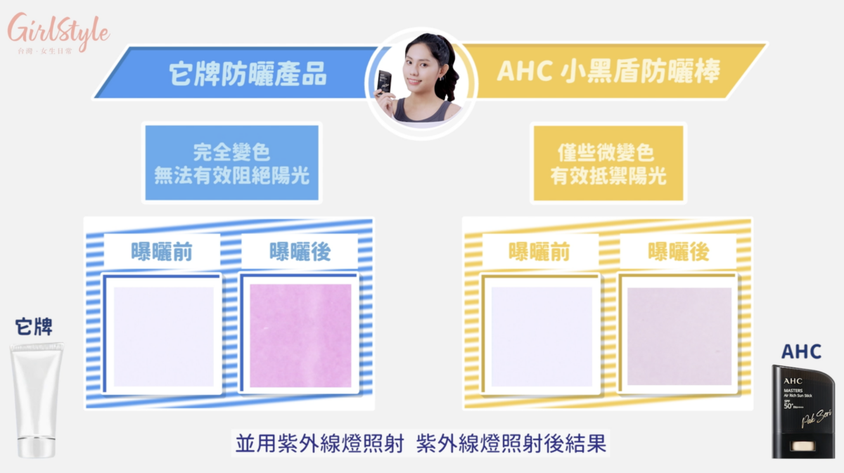 第一回合就先來看看最重要的防曬力,不只可以防止曬黑,更重要的是要抵禦紫外線的傷害呢!小編特地準備防曬小卡,和紫外線燈來做實測,把AHC小黑盾和他牌來做比較。