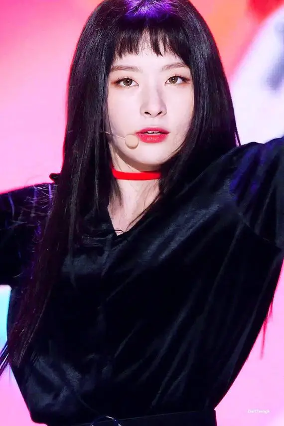 同樣是Red Velvet成員的瑟琪在團體推出Peek-A-Boo時期也剪過眉上狗啃式瀏海,當時可是靠著這個髮型圈粉無數粉絲!搭配直黑長髮瑟琪完美的與歌曲怪誕神秘風格,又帥又美的形象,成為許多粉絲心中的絕美造型。