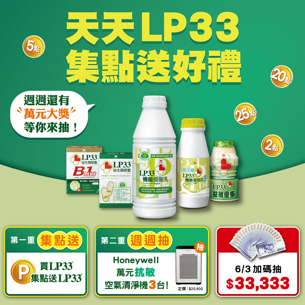 現在買還可直接參加《天天LP33,集點送好禮》品牌活動,即日起至6/2(日),到各大通路購買LP33貼標產品,憑活動貼紙序號登入活動網站集點,就有機會免費帶回價值千元的LP33益生菌膠囊,買越多換越多!