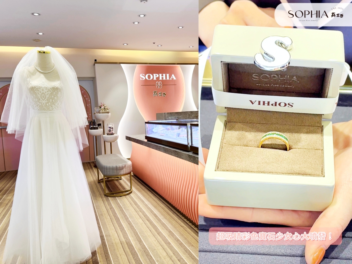 走經過就是滿滿的粉紅泡泡,店門口擺放一襲清純的新娘白紗,瞬間掀起想結婚的慾望(小編的白馬王子什麼時候來求婚呢?)。擺放在蘇菲亞店內的每顆閃耀寶石,都是親身挑選,並親自監督珠寶製作的每一個步驟,目的就是要在各位面前呈現最耀眼的光芒,意指在婚嫁時閃耀登場,愛對方的同時,更要寵愛自己。