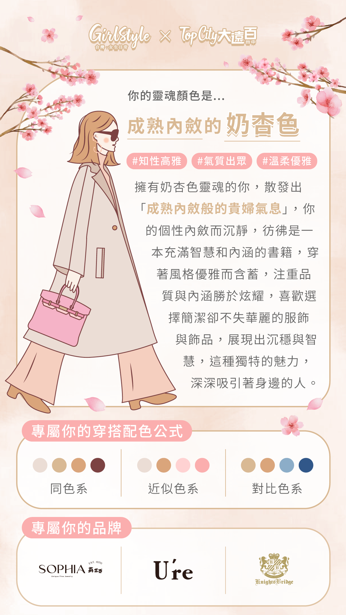 擁有奶杏色靈魂的你,散發出「成熟內斂般的貴婦氣息」,你的個性內斂而沉靜,彷彿是一本充滿智慧和內涵的書籍,穿著風格優雅而含蓄,注重品質與內涵勝於炫耀,喜歡選擇簡潔卻不失華麗的服飾與飾品,質感好的衣服能夠從視覺上和感覺上帶來很好的體驗,時刻展現出沉穩與智慧,這種獨特的魅力,深深吸引著身邊的人。