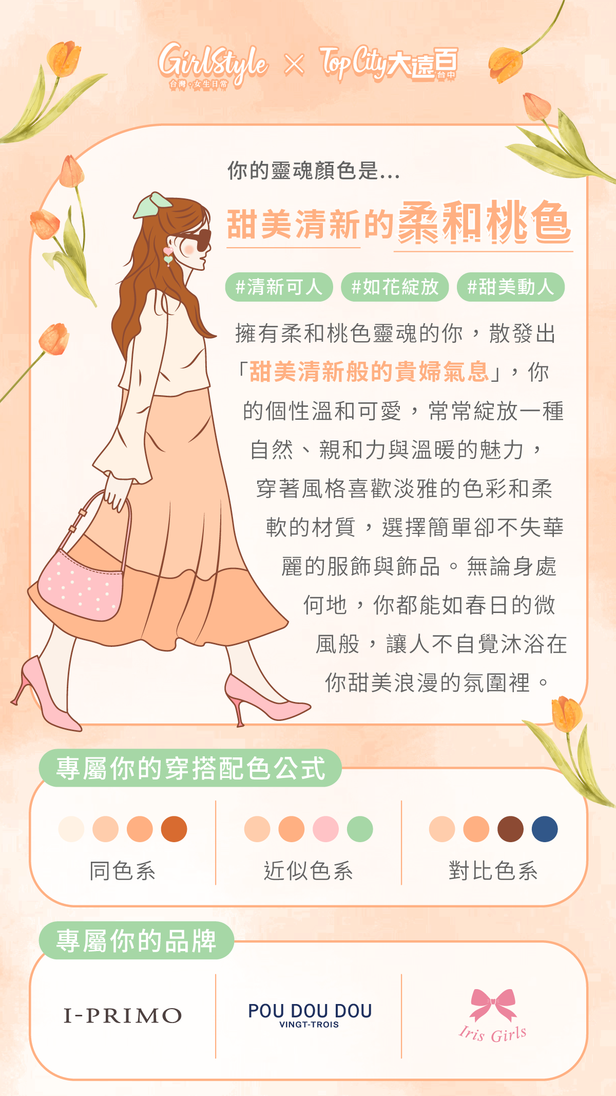 擁有柔和桃色靈魂的你,散發出「甜美清新般的貴婦氣息」,你的個性溫和可愛,常常綻放一種自然、親和力與溫暖的魅力,減少較違和、繁雜的配色,遵循化繁為簡這個原則,選擇風格淡雅的色彩和柔軟的材質,簡單卻不失華麗的服飾與飾品,讓人不自覺沐浴在你甜美浪漫的氛圍裡。