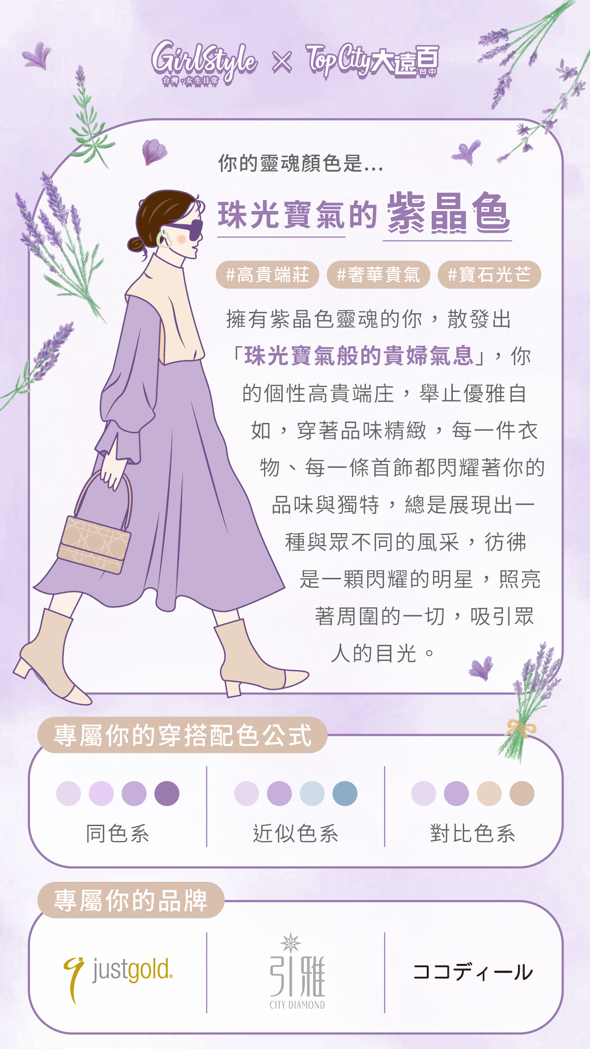 想要穿出貴婦高級感,最直接的方法就是選擇質量好的服飾,擁有紫晶色靈魂的你,散發出「珠光寶氣般的貴婦氣息」,你的個性高貴端庄,舉止優雅自如,穿著品味精緻,每一件衣物、每一條首飾都閃耀著你的品味與獨特,舉手投足間都能夠自然而然的抬高你的氣場和優雅感,展現出一種與眾不同的風采。