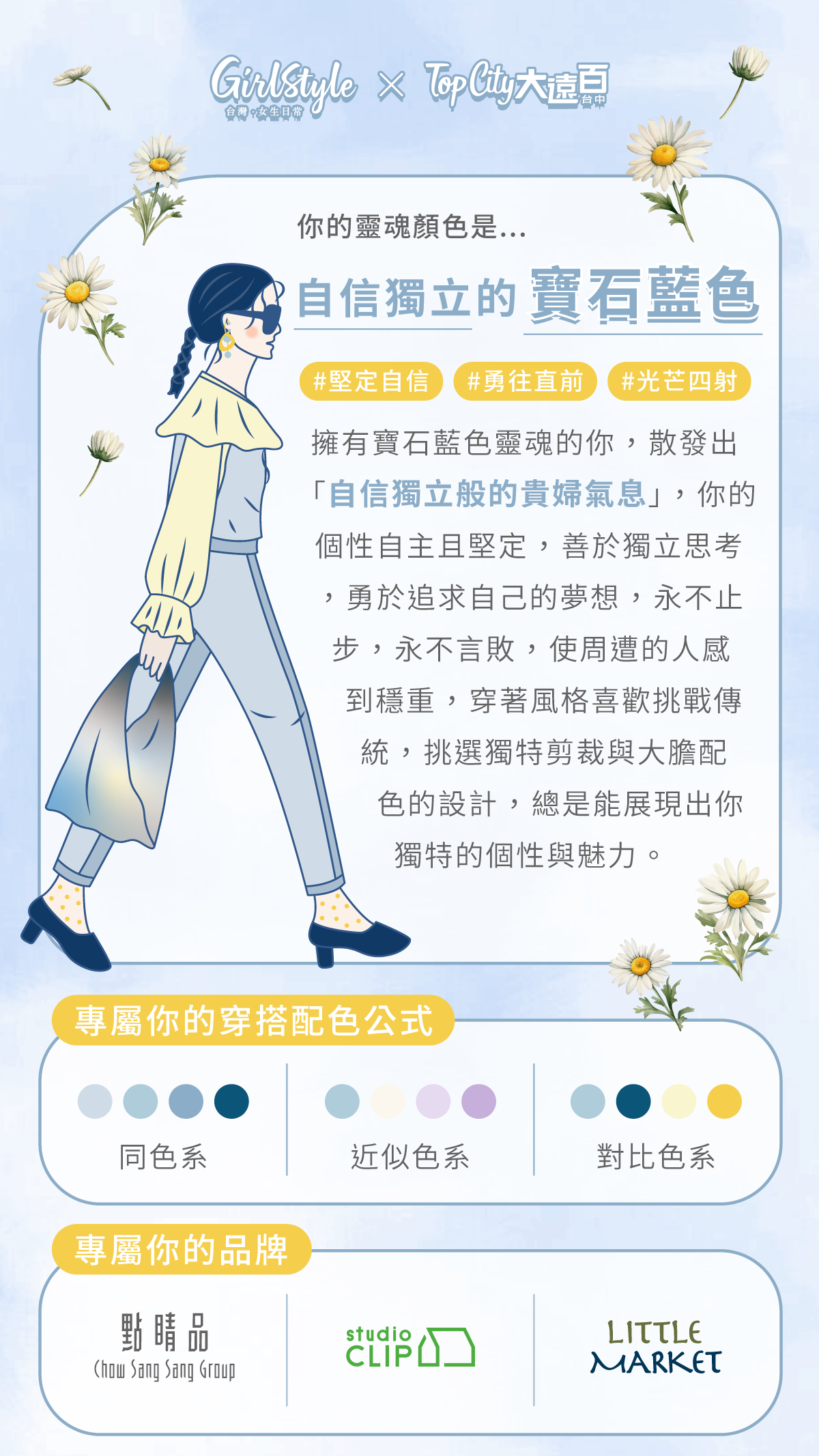擁有寶石藍色靈魂的你,散發出「自信獨立般的貴婦氣息」,你的個性自主而堅定,善於獨立思考,勇於追求自己的夢想,永不止步,永不言敗,穿著風格喜歡挑戰傳統,挑選獨特剪裁與大膽配色的設計,總是能展現出你獨特的個性與魅力。