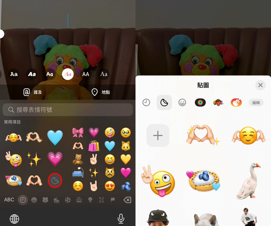 其實自製貼圖就是利用iPhone可以選取照片中人物,並摳圖出來的功能,因此我們才需要先在IG中先製作~之後要Po限時動態想要放上做好的貼圖時,開啟鍵盤打開emoji欄位並在常用項目中點選一個「被撕一角的貼紙符號」,進去就會看到所有曾經製作過的貼圖,按一下就可以加入照片完成裝飾囉!