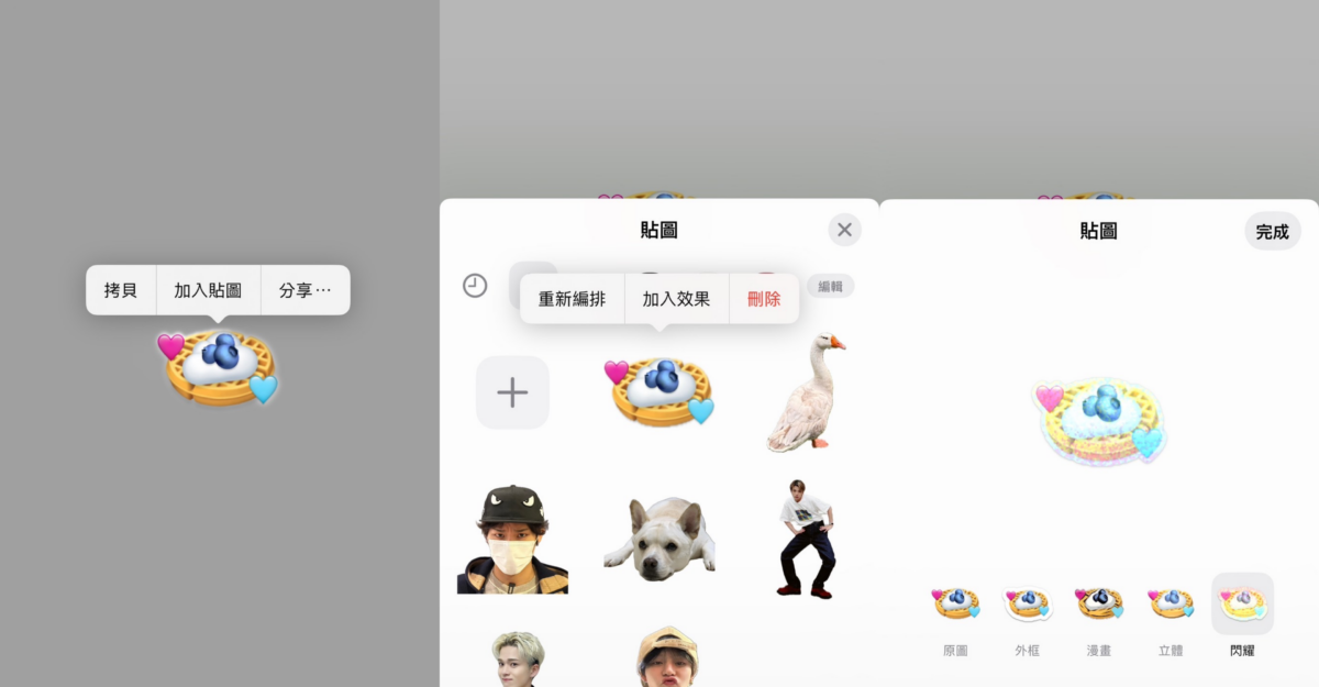完成了之後就可以在右上角儲存照片,然後開啟相簿,找到剛剛製作好的貼圖照片。長按貼圖畫面就會出現「加入貼圖」的選項,點擊後手機就會自動放進貼圖庫中,除此之外,製作好的貼圖還可以「加入效果」,隨時可以更改5種不同風格的特效樣式,讓貼圖更炫♡