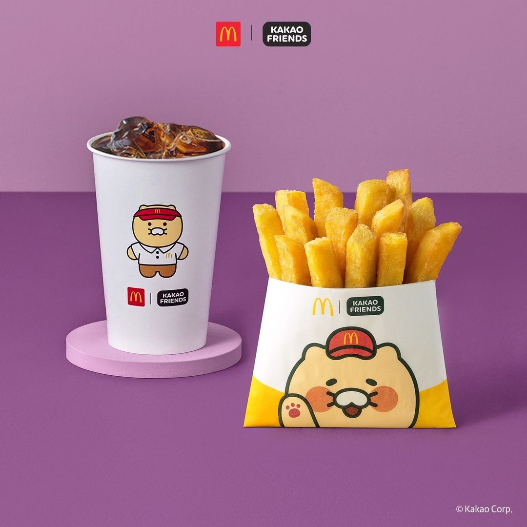 春值療癒的魅力誰都無法擋,近年來人氣爆棚!因此韓國麥當勞就特別邀請春植打工代言,與KAKAO FRIENDS聯名以牠最愛吃的地瓜推出「地瓜薯條」套餐,還有限定春植圖案杯子、包裝袋♡