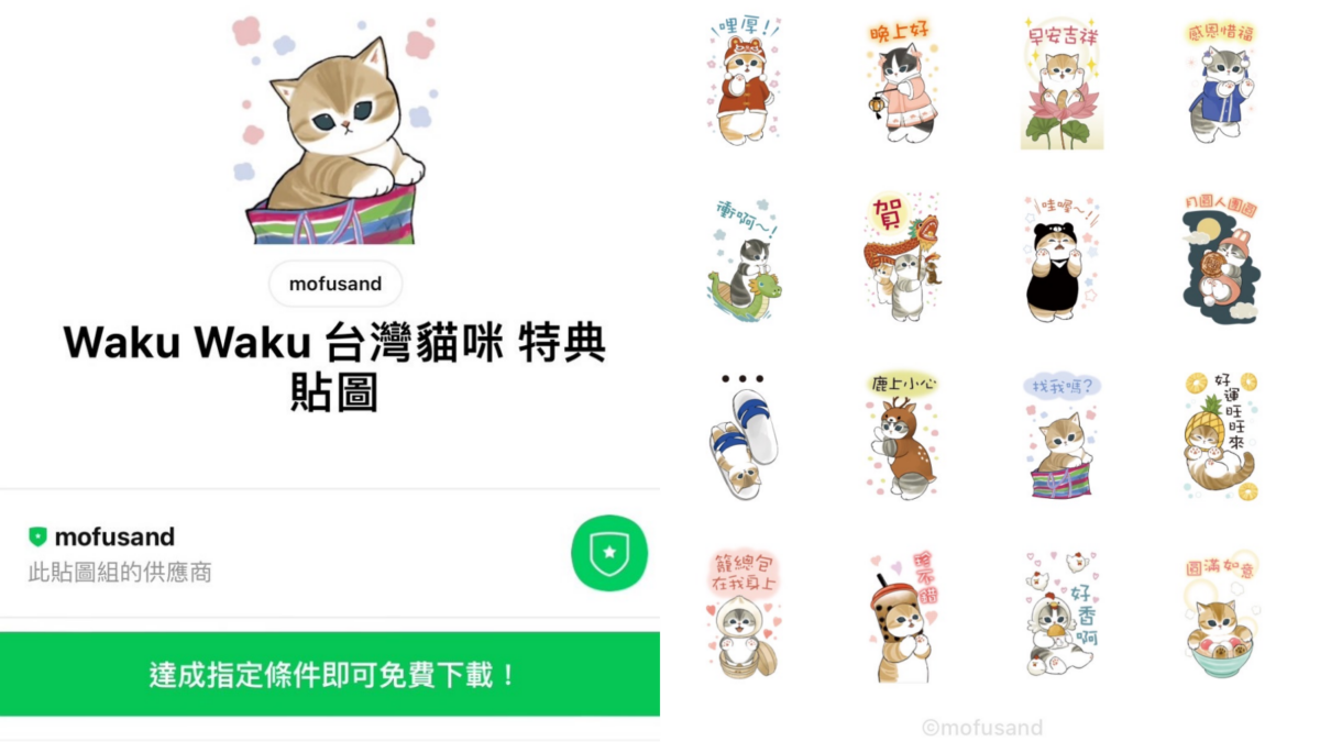 現在連貼圖都有限定特典!日本超人氣插畫「mofusand貓福珊迪」因唯美畫風與可愛搞怪的貓貓變裝受到大家歡迎,近期與不斷與三麗鷗聯名更是引起粉絲瘋狂搶購。為了回饋台灣粉絲,貓福珊迪特別推出台灣獨家超可愛「Waku Waku 台灣貓咪特典貼圖」,只需完成指定條件就可以免費獲得並永久使用,現在就來看如何領取吧!