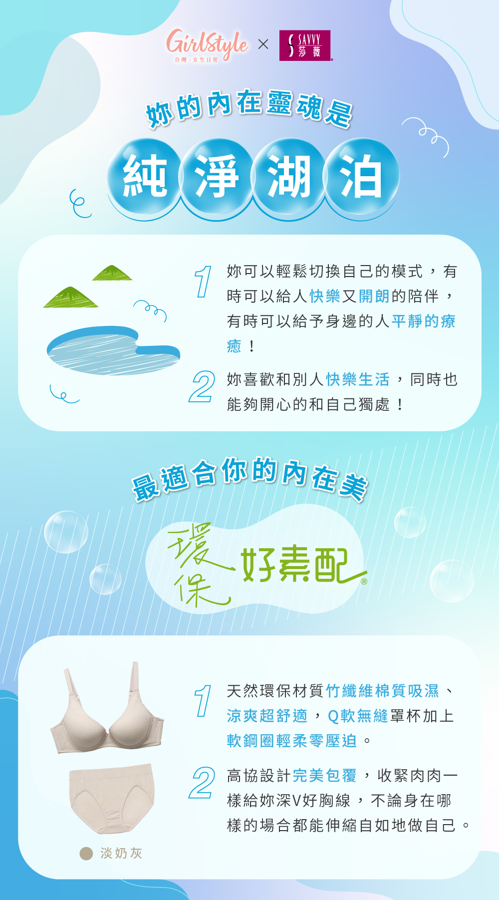 最適合妳的內在美是環保好素配,天然環保材質竹纖維棉質吸濕、涼爽超舒適,Q軟無縫罩杯加上軟鋼圈輕柔零壓迫,高協設計完美包覆,收緊肉肉一樣給妳深V好胸線,不論身在哪樣的場合都能伸縮自如地做自己。