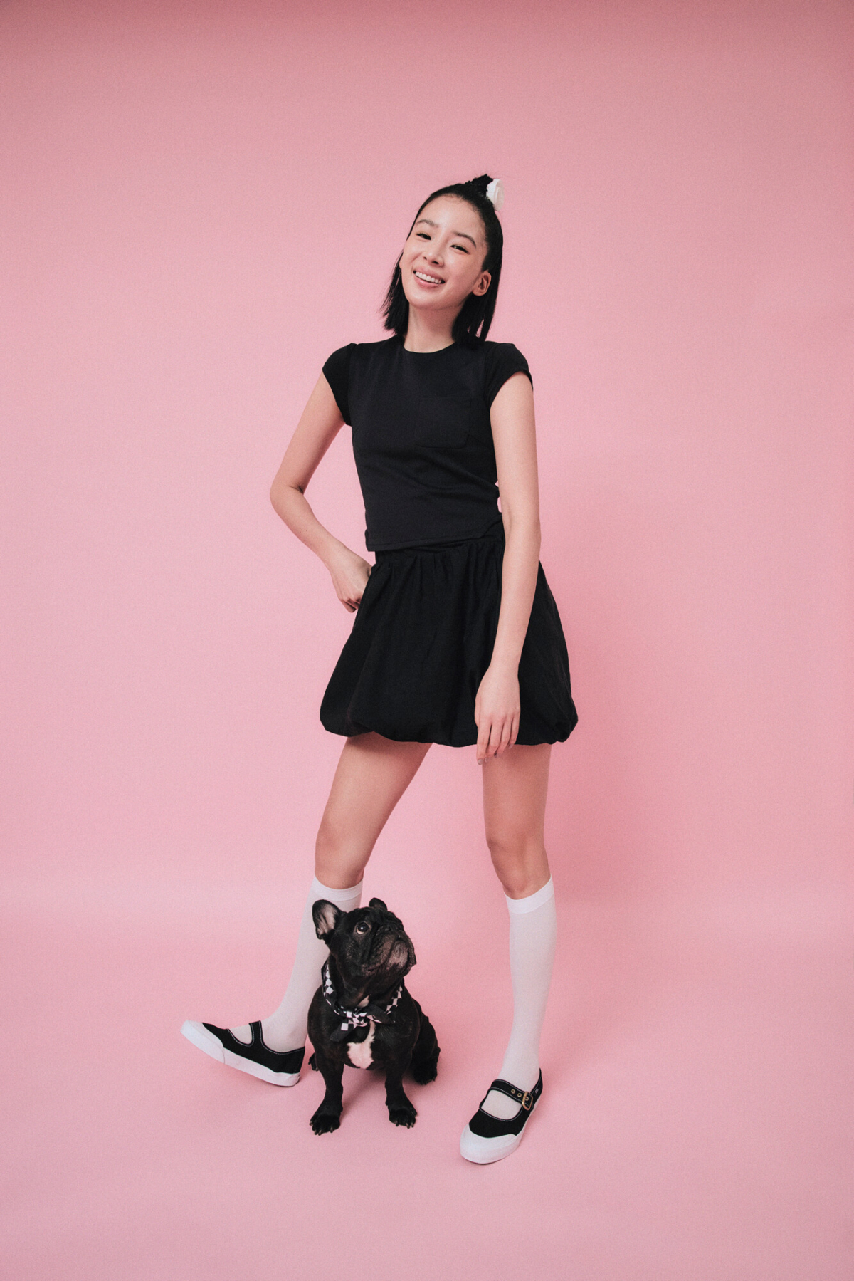 平時穿搭充滿俏皮個性感的Rin,喜歡隨著心情喜好選擇當天的穿搭風格,並偷渡一點反差的元素,Rin本次選擇穿著一件立挺的白色襯衫,抓皺的剪裁帶出上半身的份量感,下半身選擇黑色的透膚蛋糕紗裙,強烈的視覺效果又帶出一絲柔美氣質,穿上黑色的Vans Mary Jane加上白色長襪更增加了點俏皮甜美的氛圍!