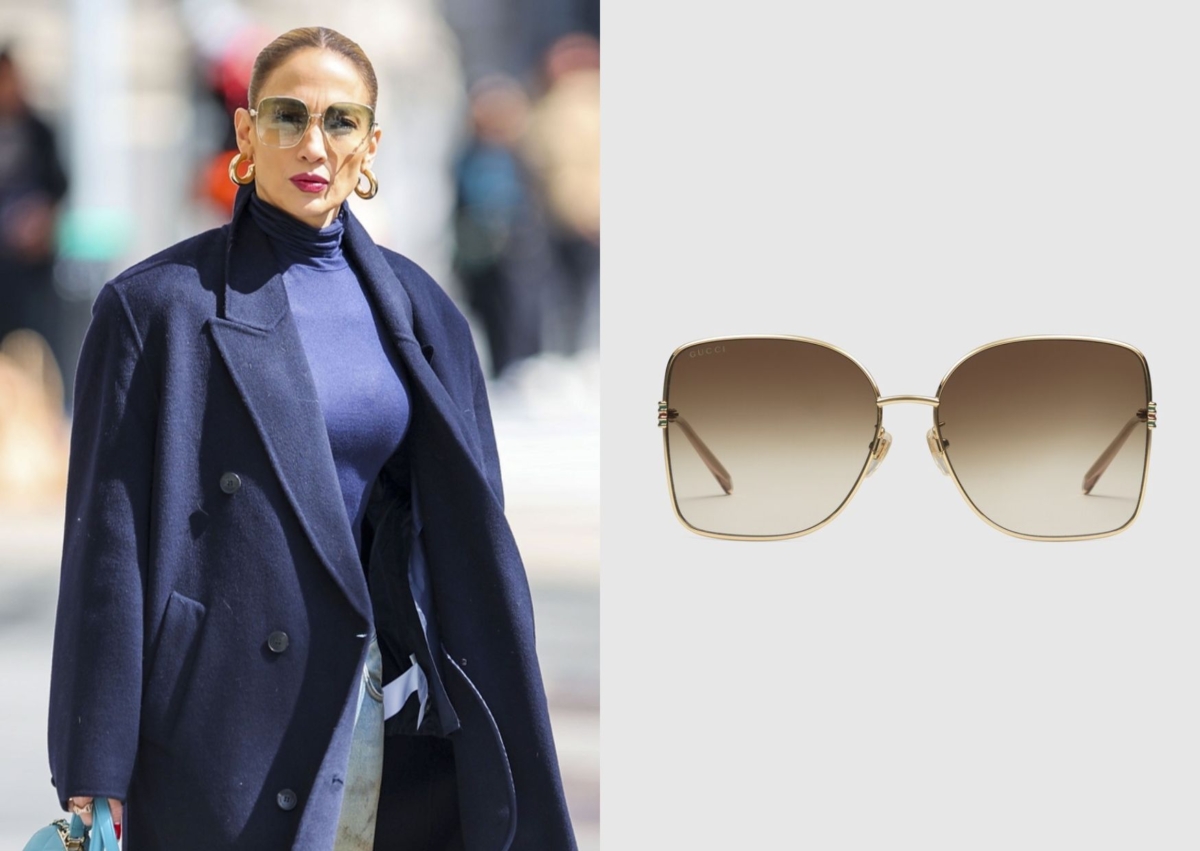 珍妮佛羅培茲 Jennifer Lopez 街拍穿戴 Gucci 太陽眼鏡作為全身造型的點睛之筆!這隻 Gucci 金色金屬鏡框採光面金色金屬鏡臂,綴以漸變棕色醋酸纖維末端及鏡片、低調的琺瑯織帶和 Interlocking G 細節,她以質感調的深藍色大衣搭配棕色系墨鏡,為整體造型增添層次感!